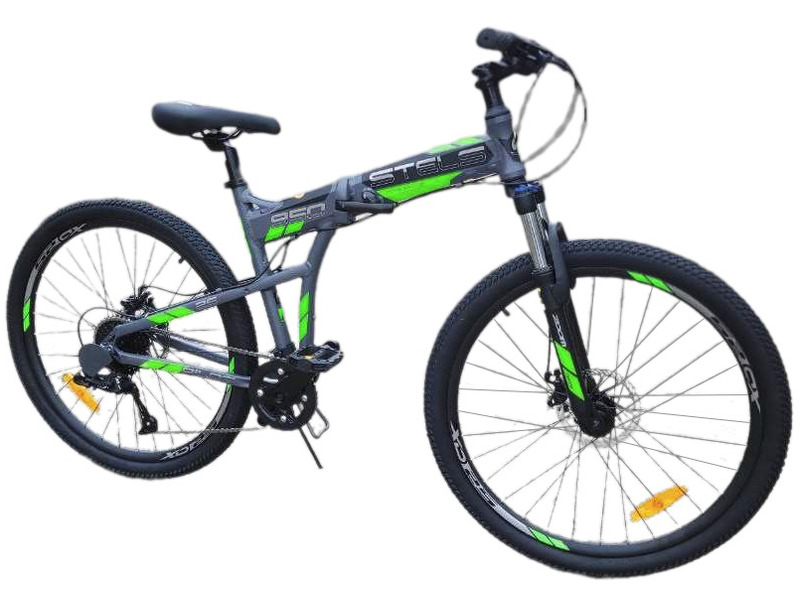 Складной горный велосипед с навесным оборудованием Microshift, 7 скоростей. Технические особенности: алюминиевая рама (складной механизм, открытая проводка, кареточный стакан BSA, прямой рулевой стакан, крепление калипера IS, съемный петух), амортизационная вилка Zoom (ход 60 мм, блокировка, регулировка преднагрузки, крепление калипера IS), двойные алюминиевые обода (под AV ниппель), дисковые механические тормоза (роторы 160/160 мм), катафоты, подножка. Подходит для прогулочной езды по различным дорогам и пересеченной местности. Диаметр колес - 26 дюймов. Вес - 15,4 кг.