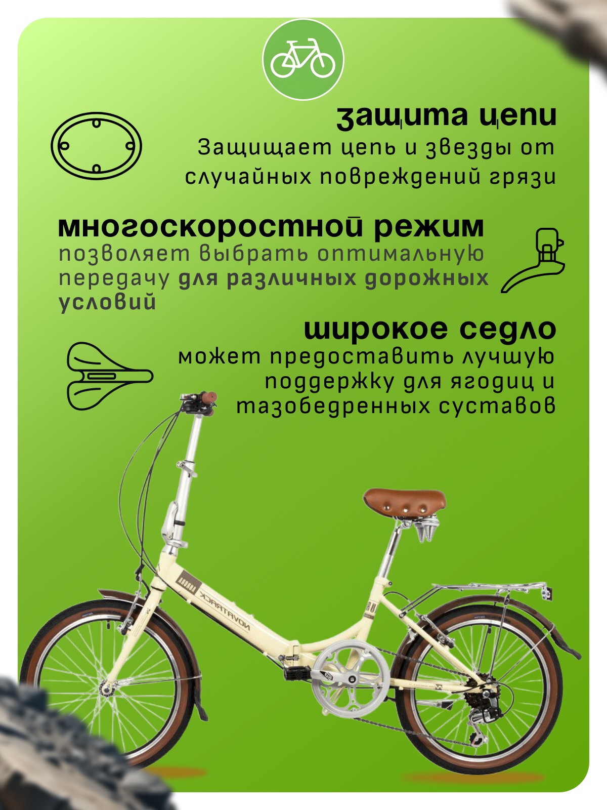 Особенности велосипеда: Багажник, Двойные обода, Защита цепи, Звонок, Катафоты, Крылья, Многоскоростной, Подножка, Широкое седло.