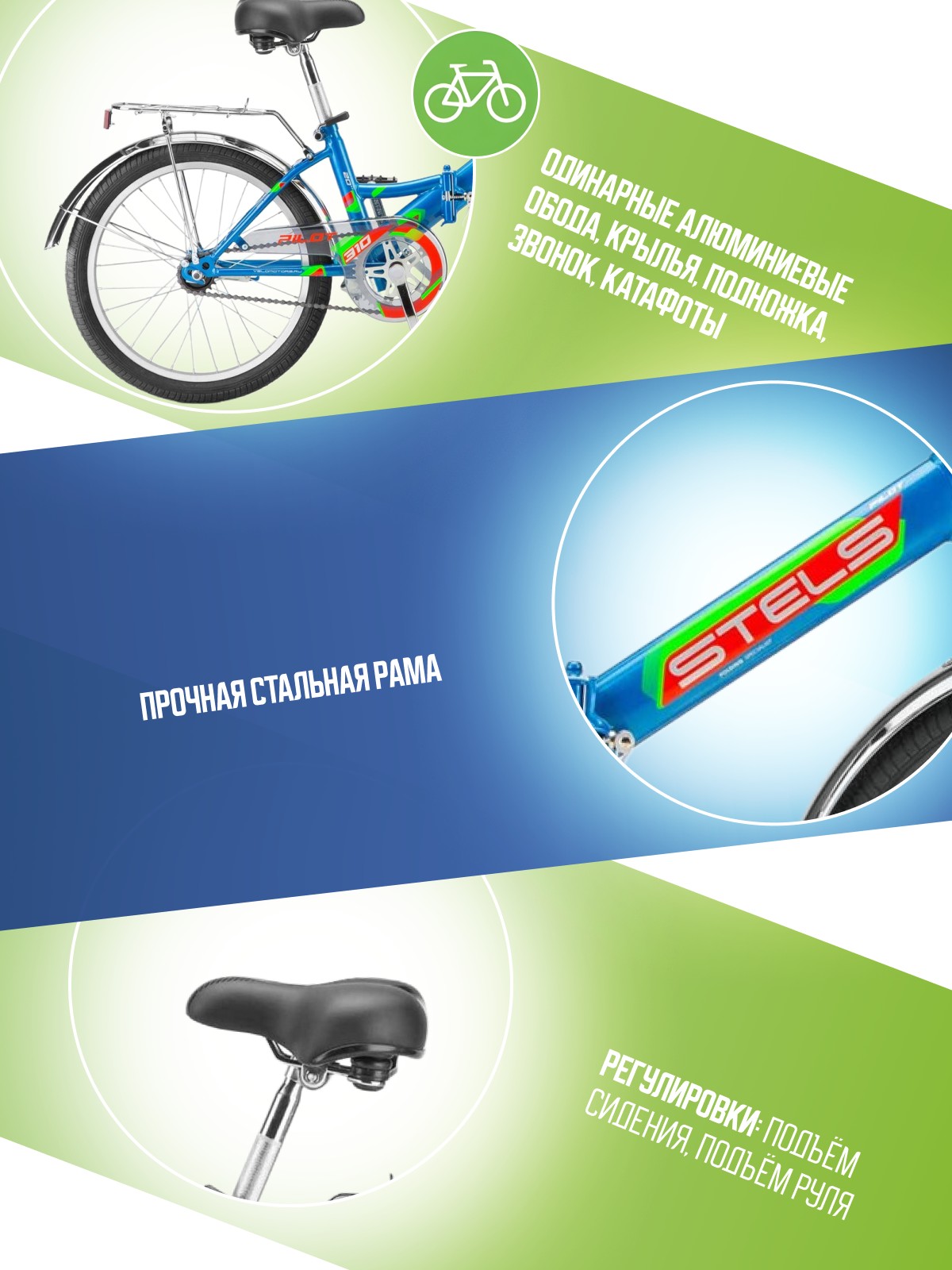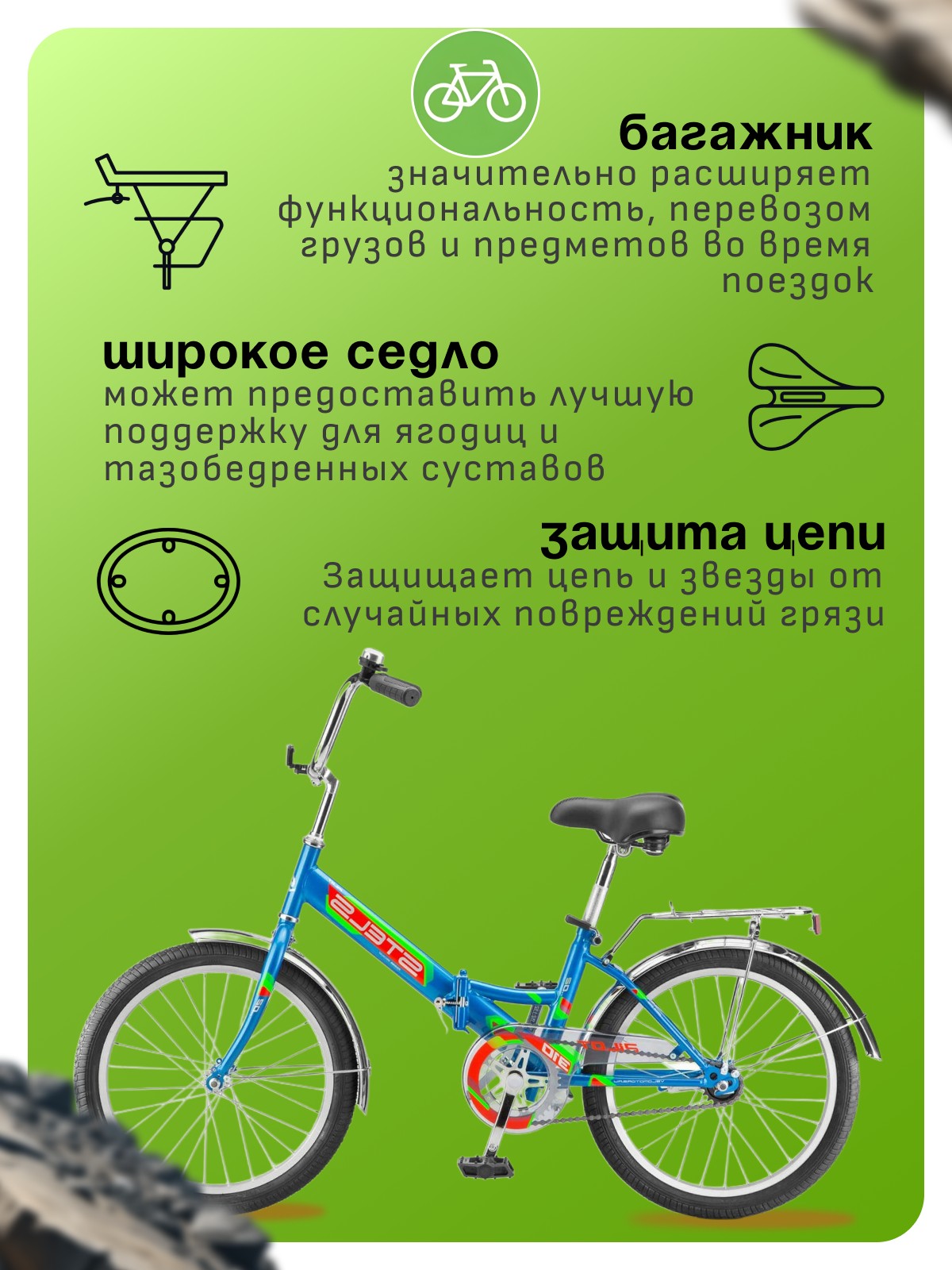 Особенности велосипеда: Багажник, Защита цепи, Звонок, Катафоты, Крылья, Ножной тормоз, Подножка, Широкое седло.