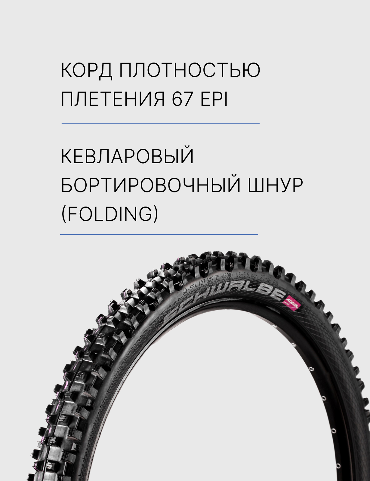 Особенности:Универсальная (DH/Enduro), корд плотностью плетения 67 EPI, кевларовый бортировочный шнур (Folding), антипрокольная защита Super Gravity, рекомендуемое давление 1.6-3.5 Bar (23-50 psi), подходит для бескамерного использования