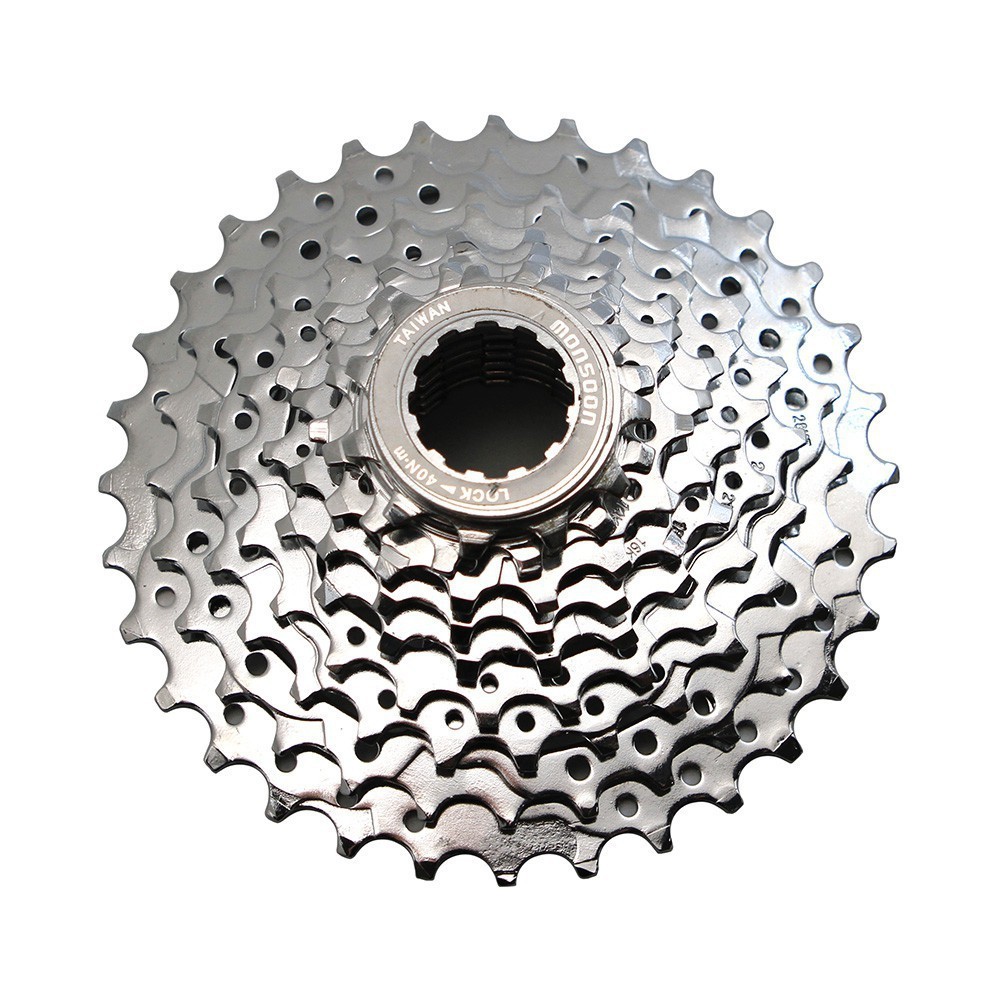 Кассета Monsoon CS9132C, произведена на Тайване, изготовлена из качественной стали с хромированным покрытием, состоит из 9 звездочек с количеством зубьев 11-32T, шлицевое крепление на барабан свободного хода задней втулки. Будет отличным выбором для горных велосипедов любительского уровня.