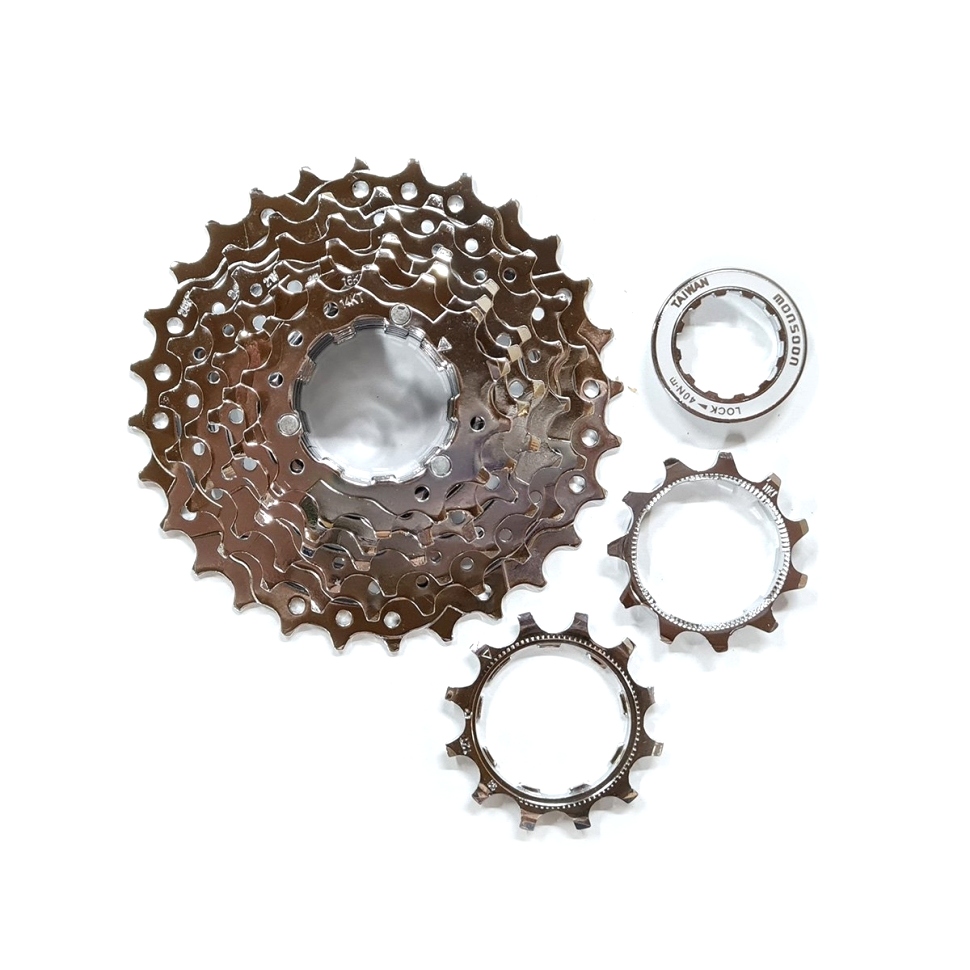 Кассета Monsoon CS8128C, произведена на Тайване, изготовлена из качественной стали с хромированным покрытием, состоит из 8 звездочек с количеством зубьев 11-28T, шлицевое крепление на барабан свободного хода задней втулки.