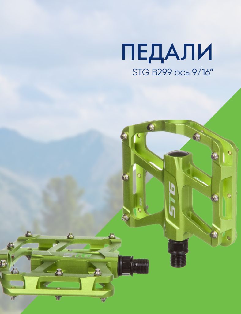 Педали STG B299 — это классические педали-платформы, разработанные для различных горных велосипедов, в том числе для даунхилла и фрирайда. Выполнены из анодированного алюминиевого сплава. Ось: 9/16ʺ. В педалях используются прочные и долговечные промподшипники. Каждая педаль оснащена шестнадцатью сменными шипами. Выпускаются в четырех цветах: оранжевый, фиолетовый, синий, зеленый. Вес с упаковкой: 640 грамм.
