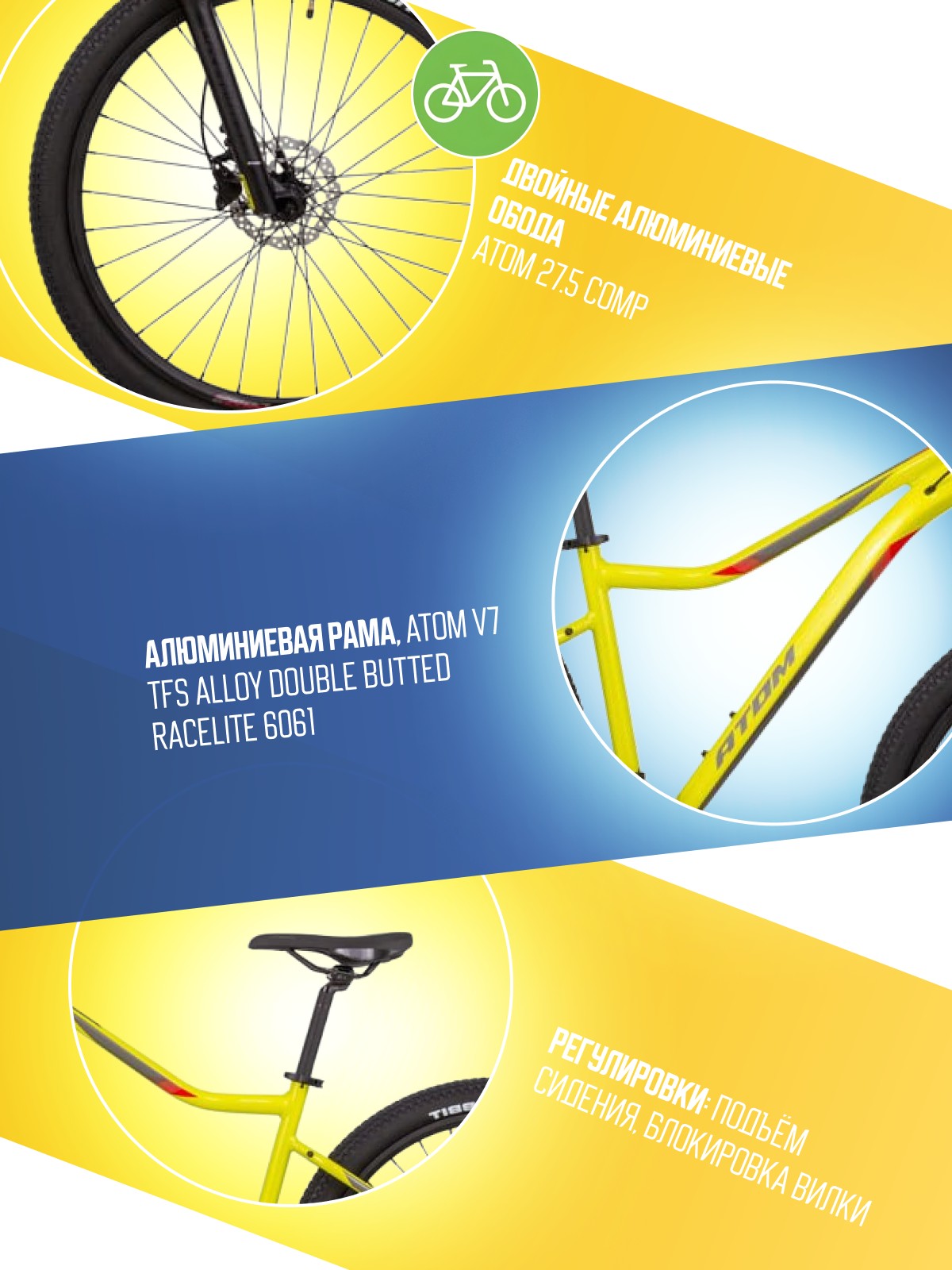 Женский горный велосипед с оборудованием любительского класса Shimano, 16 скоростей. Технические особенности: легкая алюминиевая рама ATOM V7 TFS Alloy Double butted RaceLite 6061 (двойной баттинг, скрытая проводка), амортизационная вилка ATOM Radium 30 MLO (пружинно-эластомерная, ход 100 мм, механическая блокировка), двойные алюминиевые обода ATOM 27.5 Comp, дисковые гидравлические тормоза Shimano BR-MT200 (роторы Shimano SM-RT10-S Centerlock 160/160 мм). Подходит для активной езды по различным дорогам и пересеченной местности. Диаметр колес - 27,5 дюймов. Вес - 13,2 кг.