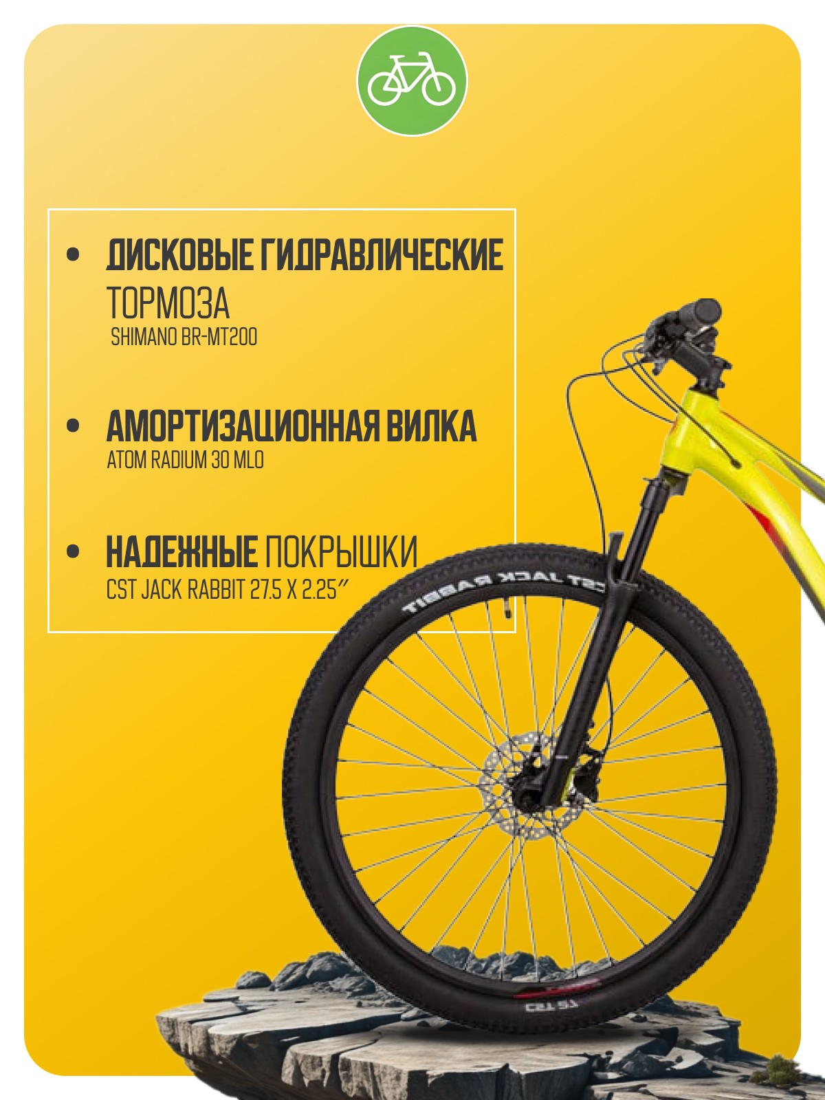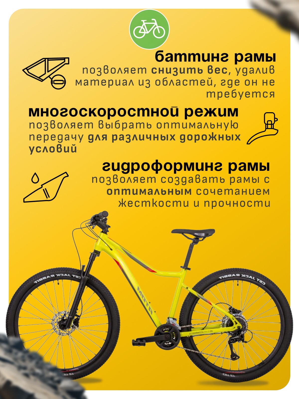 Особенности велосипеда: Алюминиевая рама, Амортизационная вилка, Баттинг рамы, Гидравлический привод тормозов, Гидроформинг рамы, Двойные обода, Дисковые тормоза, Многоскоростной.