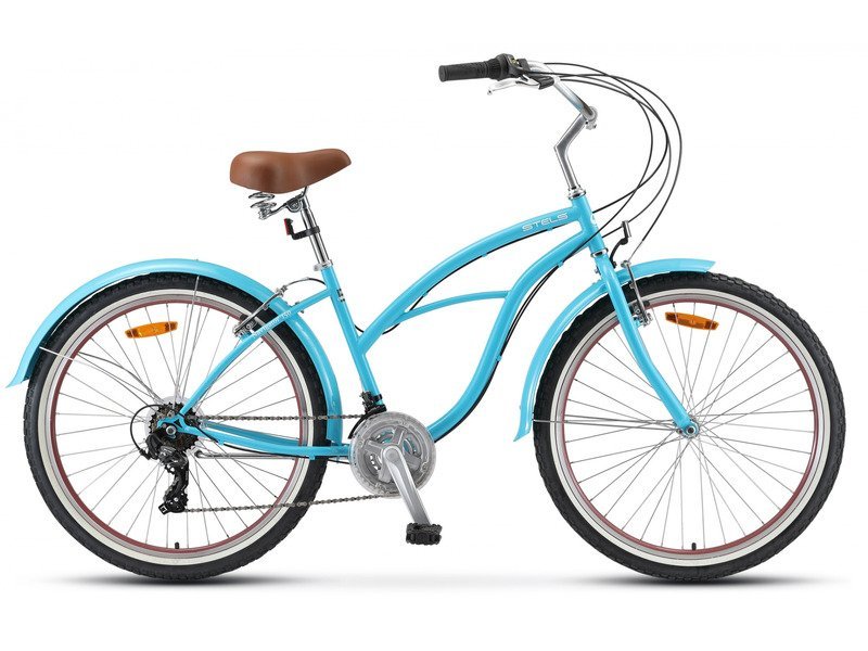 Комфортабельный женский круизер с оборудованием начального класса Shimano, 21 скорость. Технические особенности: стальная рама Hi-Ten, жесткая стальная вилка, двойные алюминиевые обода, надежные ободные тормоза V-Brake, длинные крылья, подножка. Подходит для комфортного катания по паркам и городским улицам. Диаметр колес - 26 дюймов. Вес - 17 кг.