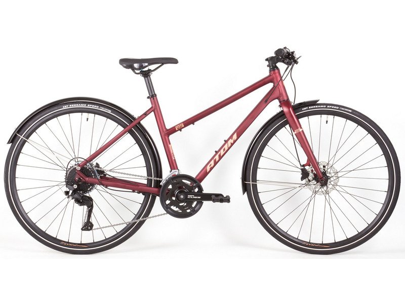 Женский дорожный велосипед с оборудованием любительского класса Shimano, 18 скоростей. Технические особенности: алюминиевая рама Alloy Triple Butted RaceLite 6061 (тройной баттинг, внутренняя проводка), жесткая алюминиевая вилка Rigid Alloy RaceLite 6061, двойные алюминиевые обода ATOM 700C Comp, дисковые гидравлические тормоза Shimano BR-MT200 (роторы Shimano RT10 160/160 мм), длинные крылья. Подходит для прогулочного и спортивного катания в городских условиях. Диаметр колес - 28 дюймов. Вес - 15 кг.