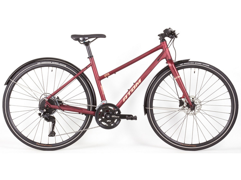 Женский дорожный велосипед с оборудованием любительского класса Shimano, 18 скоростей. Технические особенности: алюминиевая рама Alloy Triple Butted RaceLite 6061 (тройной баттинг, внутренняя проводка), жесткая алюминиевая вилка Rigid Alloy RaceLite 6061, двойные алюминиевые обода ATOM 700C Comp, дисковые гидравлические тормоза Shimano BR-MT200 (роторы Shimano RT10 160/160 мм), длинные крылья. Подходит для прогулочного и спортивного катания в городских условиях. Диаметр колес - 28 дюймов. Вес - 15 кг.