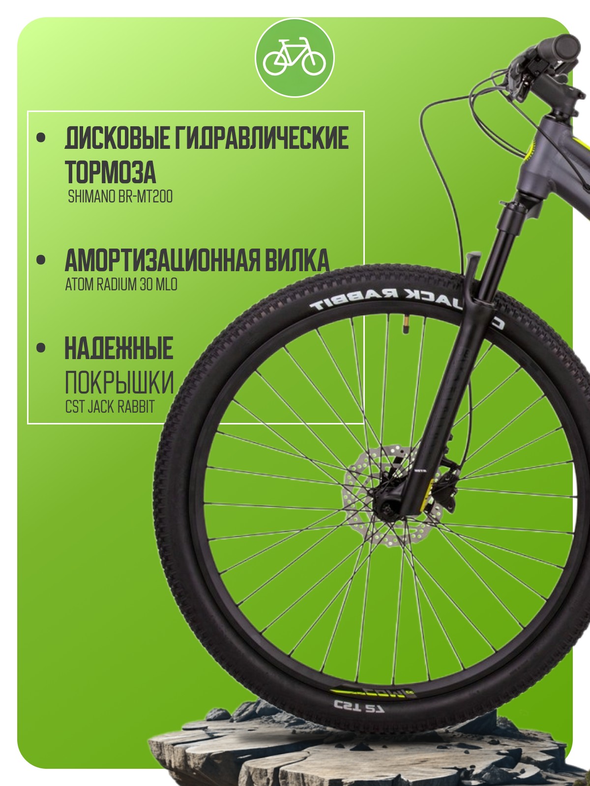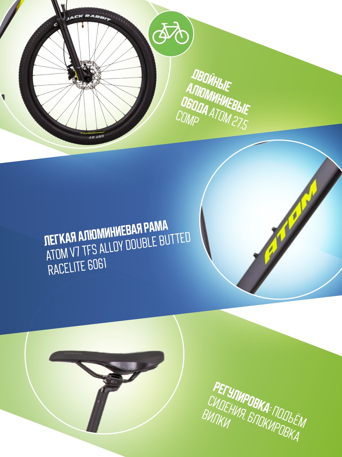 Женский горный велосипед с оборудованием любительского класса Shimano, 16 скоростей. Технические особенности: легкая алюминиевая рама ATOM V7 TFS Alloy Double butted RaceLite 6061 (двойной баттинг, скрытая проводка), амортизационная вилка ATOM Radium 30 MLO (пружинно-эластомерная, ход 100 мм, механическая блокировка), двойные алюминиевые обода ATOM 27.5 Comp, дисковые гидравлические тормоза Shimano BR-MT200 (роторы Shimano SM-RT10-S Centerlock 160/160 мм). Подходит для активной езды по различным дорогам и пересеченной местности. Диаметр колес - 27,5 дюймов. Вес - 13,2 кг.