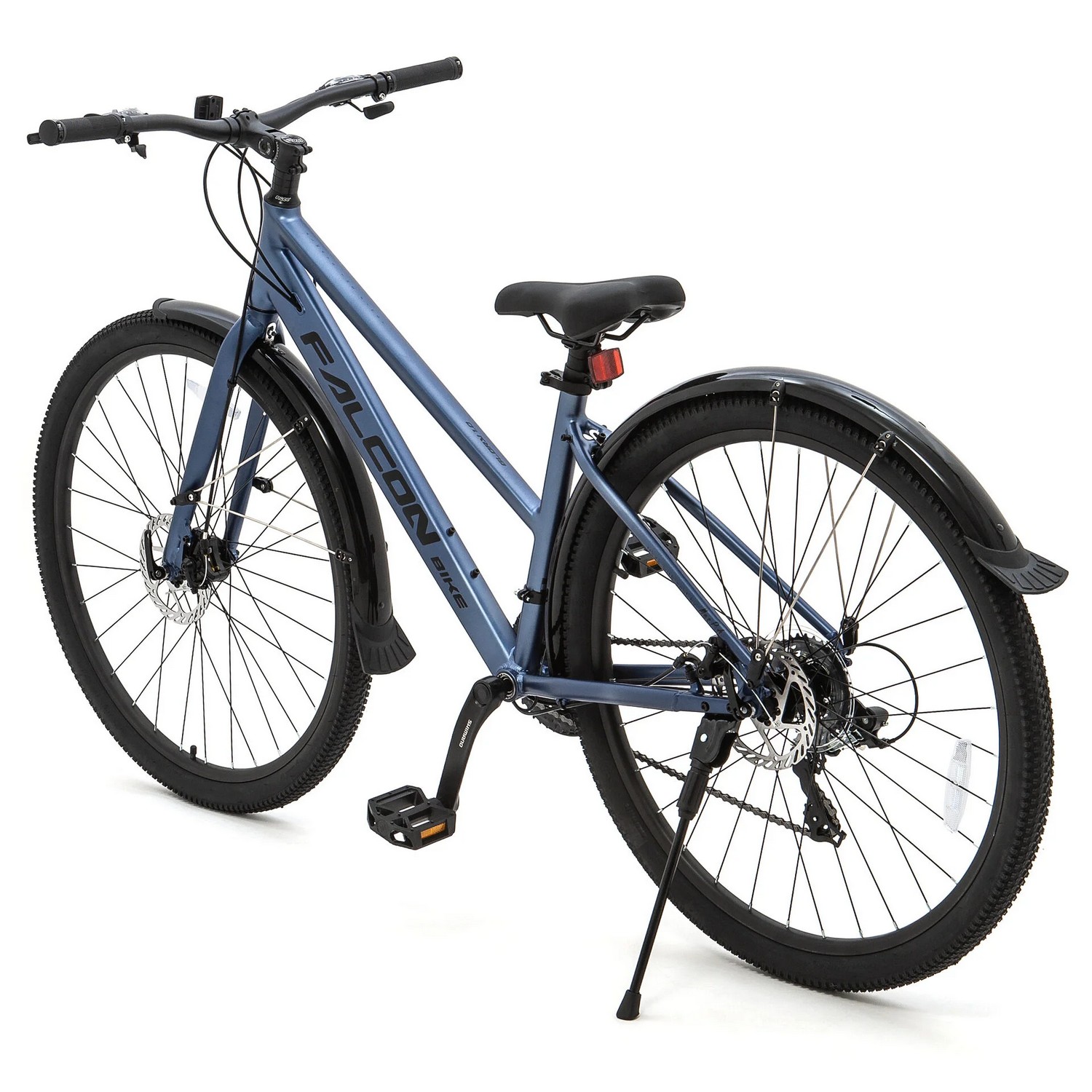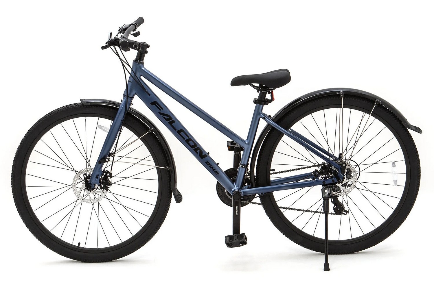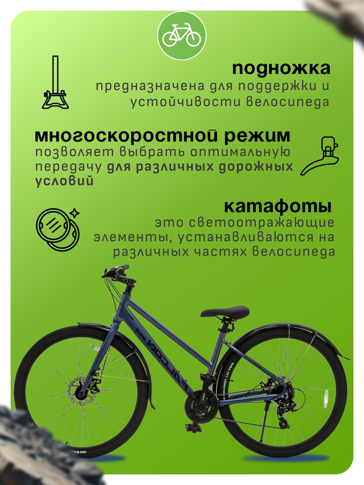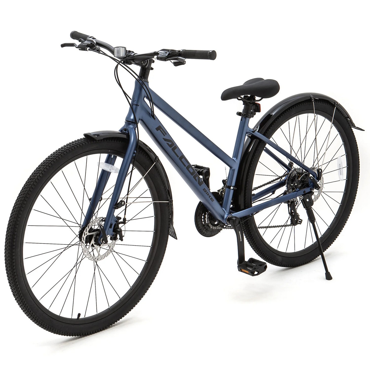 Особенности велосипеда: Алюминиевая рама, Двойные обода, Дисковые тормоза, Крылья, Многоскоростной, Подножка, Защита цепи, Катафоты.
