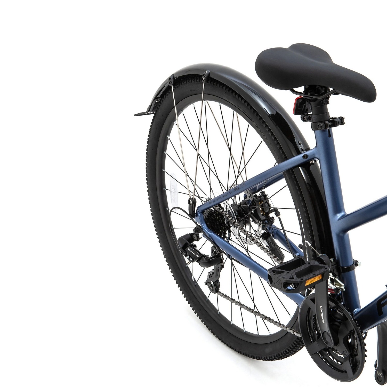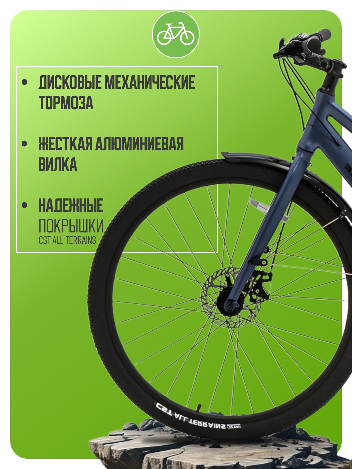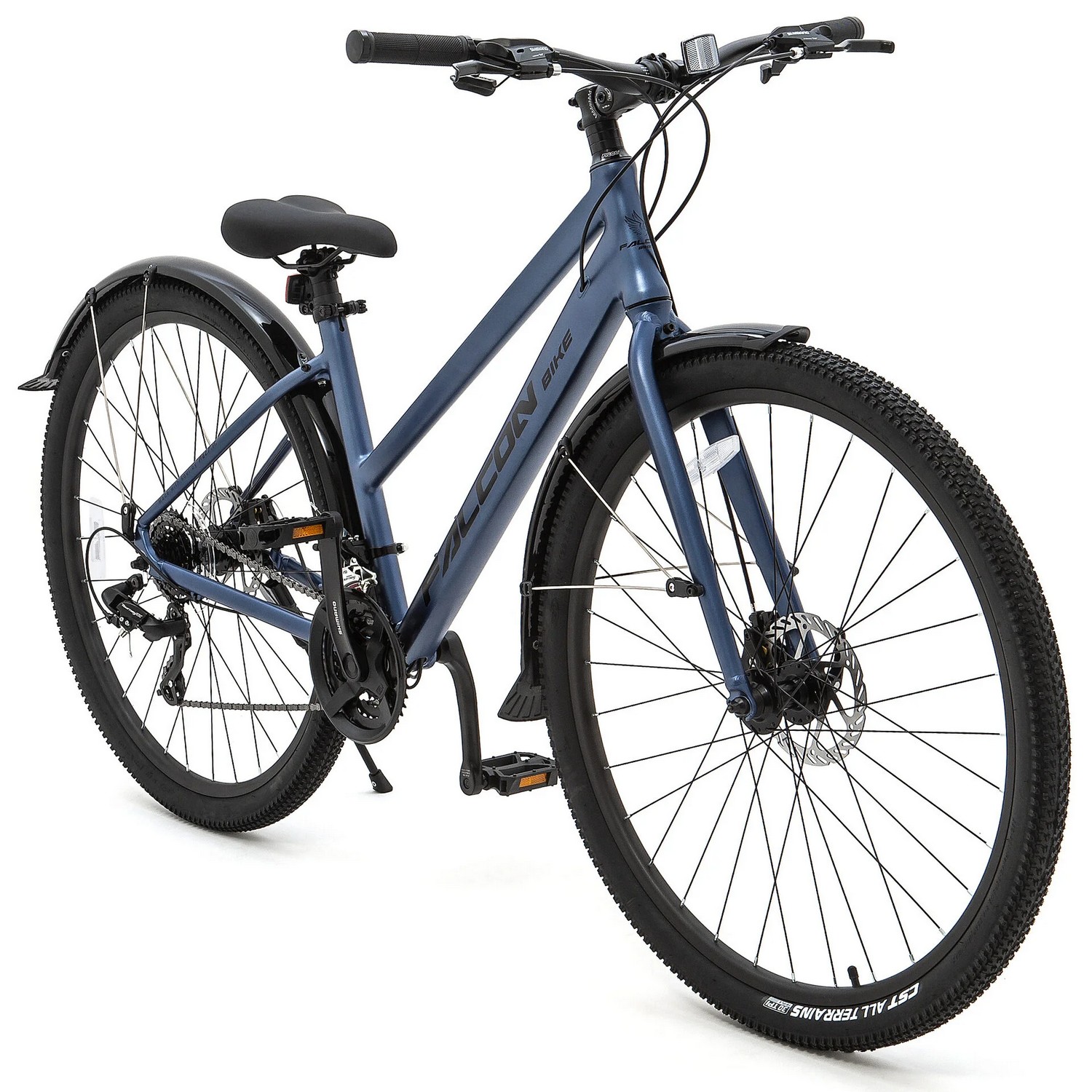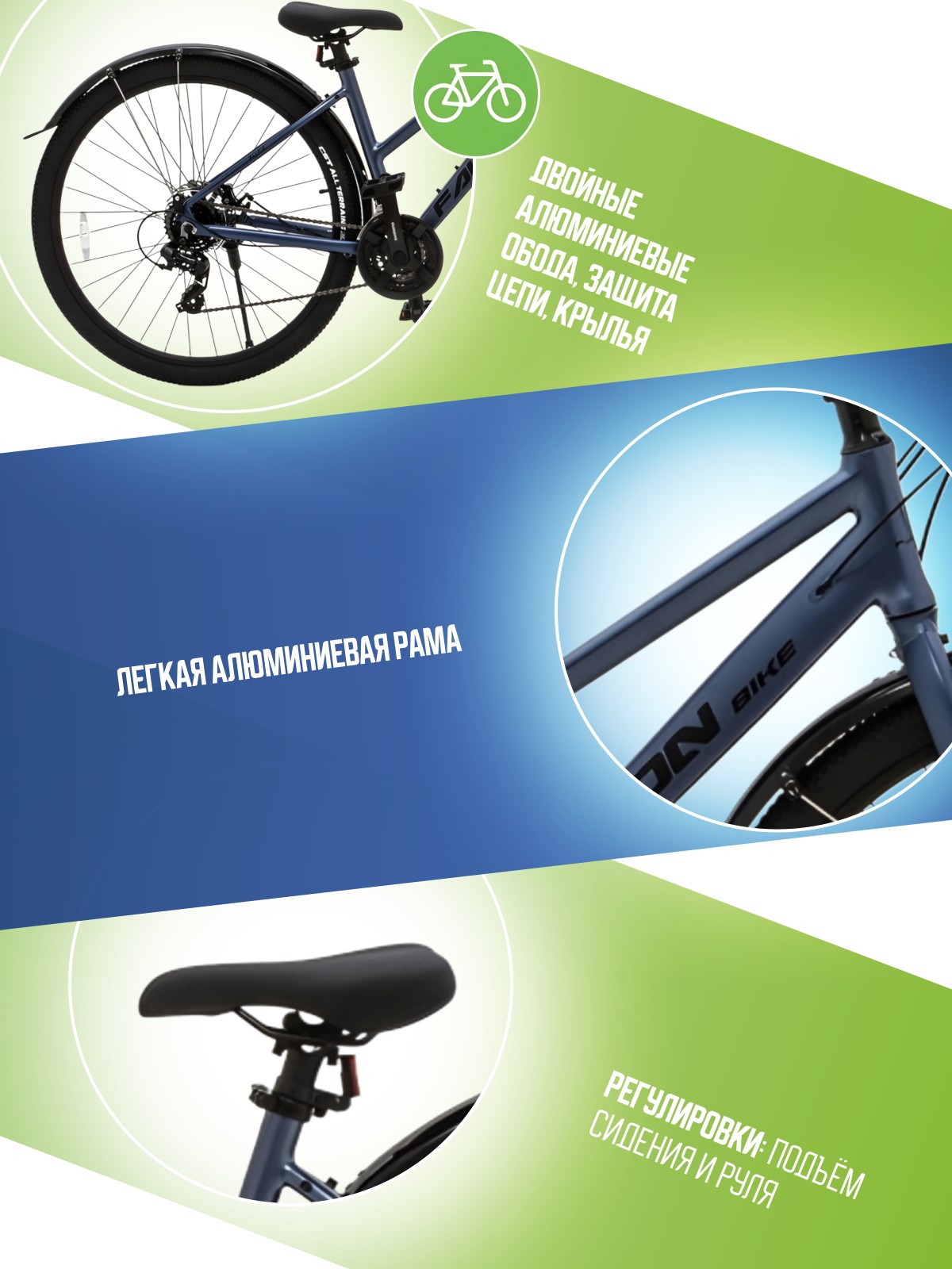 Особенности велосипеда: Алюминиевая рама, Двойные обода, Дисковые тормоза, Крылья, Многоскоростной, Подножка, Защита цепи, Катафоты.
