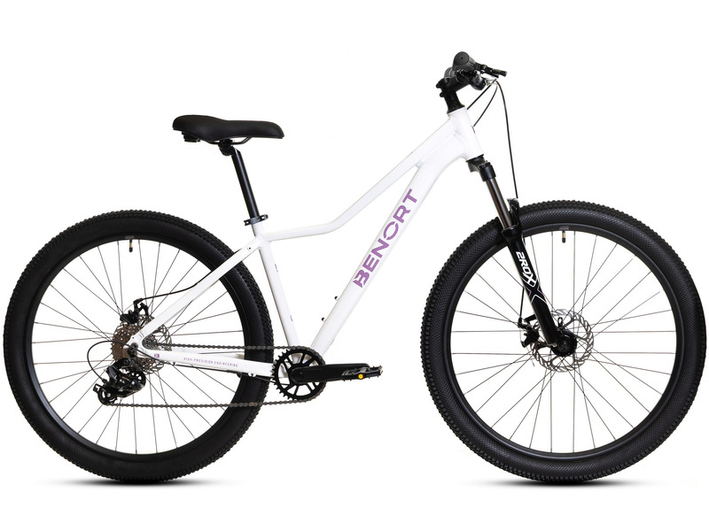Женский горный велосипед с оборудованием начального класса Shimano, 7 скоростей. Технические особенности: легкая алюминиевая рама (сплав 6061, скрытая прокладка тросов, съёмный петух, прямой рулевой стакан, крепление калипера IS, кареточный стакан BSA), амортизационная вилка 2ROXX 981 (пружинно-эластомерная, ход 100 мм, алюминиевые штаны, блокировка хода, регулировка преднагрузки, крепление калипера Post Mount), двойные алюминиевые обода (под AV ниппель), дисковые механические тормоза DX2005 (роторы 160/160 мм). Подходит для активной езды по различным дорогам и пересеченной местности. Диаметр колес - 27,5 дюймов. Вес - 13,7 кг.