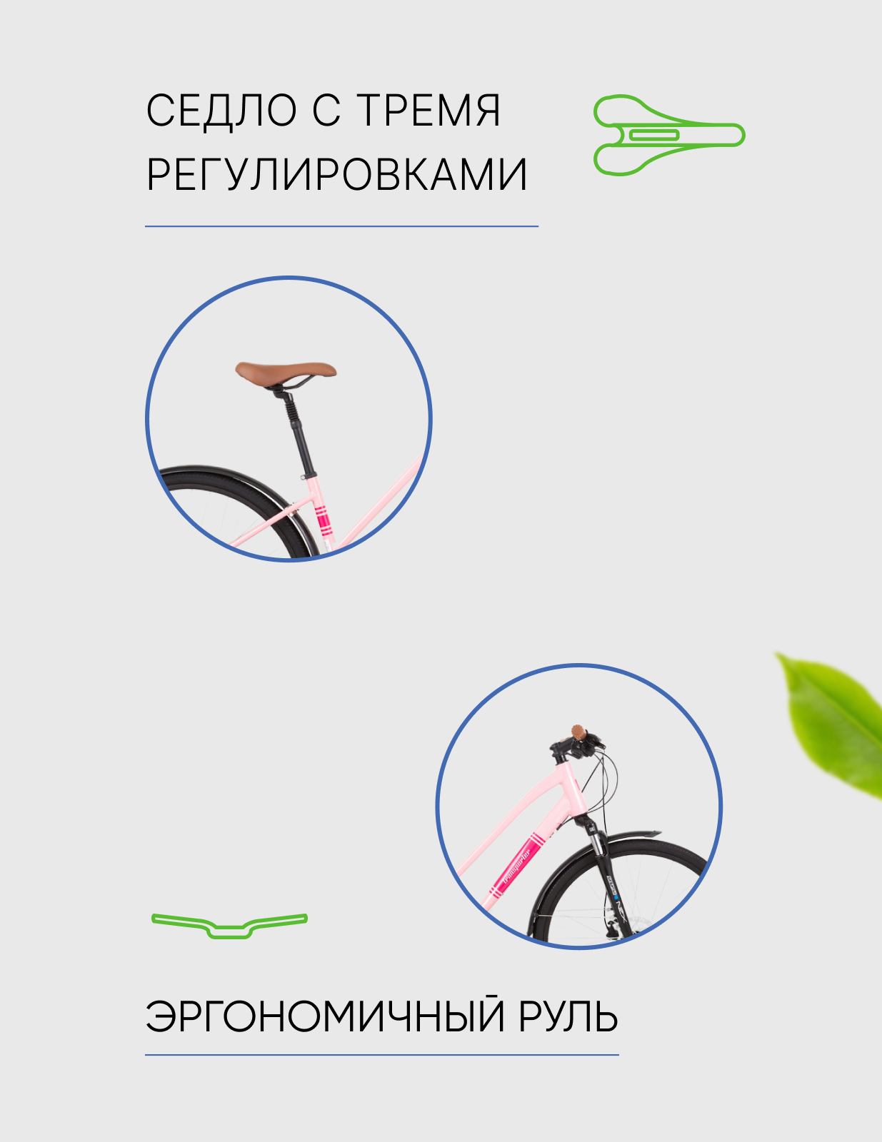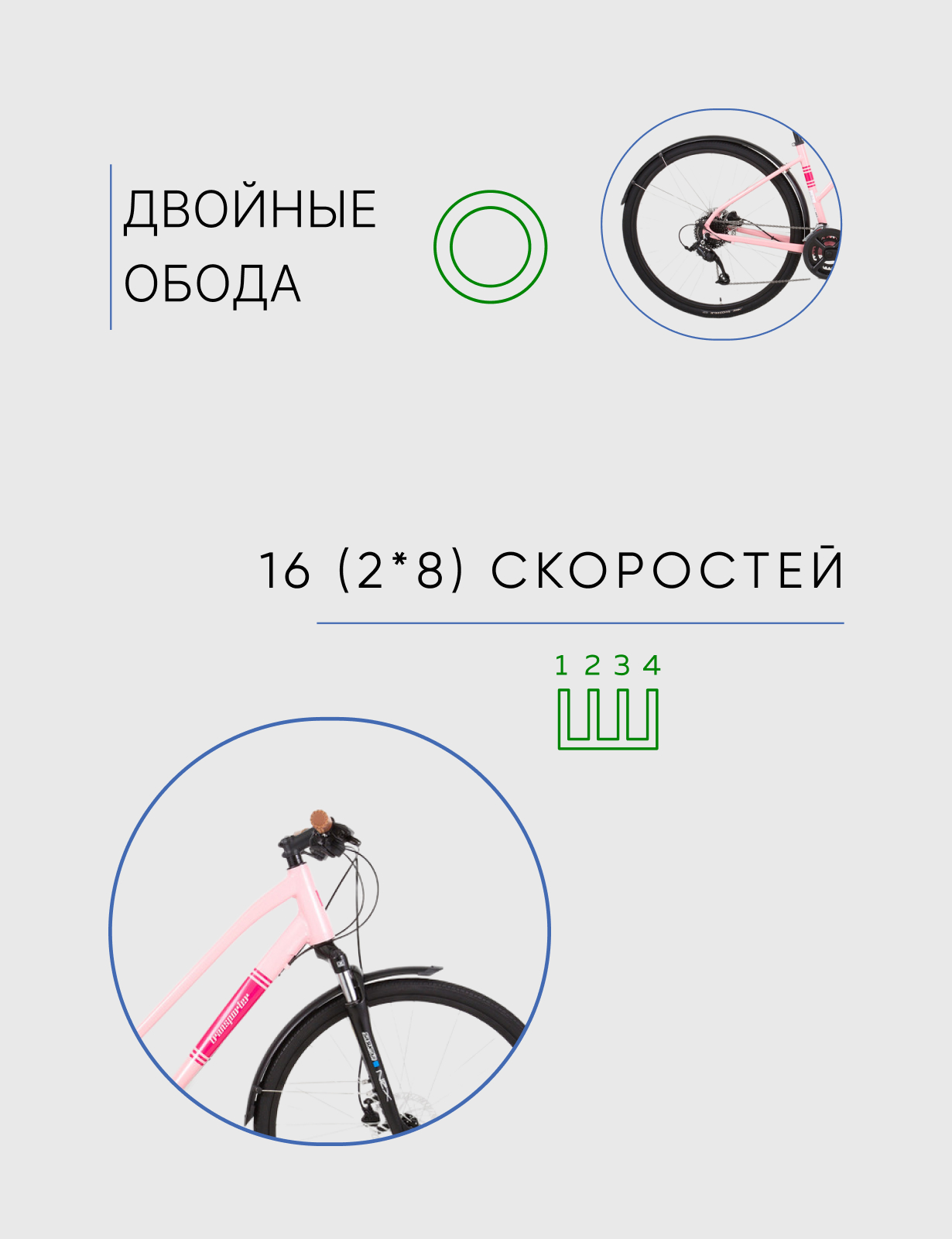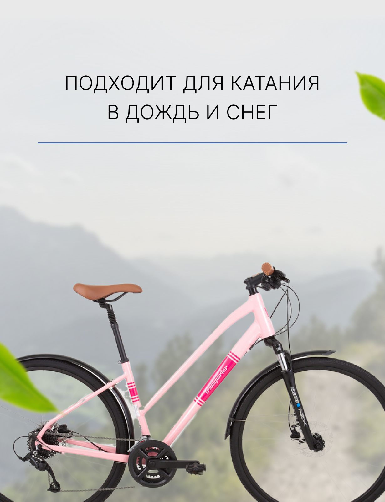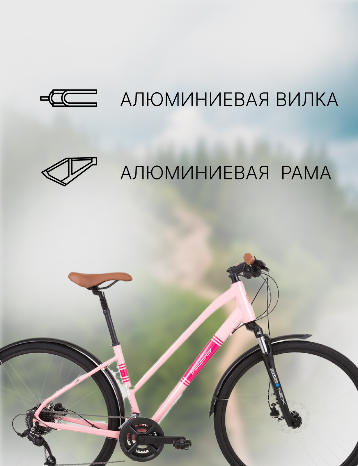 Женский дорожный велосипед с оборудованием начального класса Shimano/Microshift, 16 скоростей. Технические особенности: алюминиевая рама Alloy Road Hybrid Frame, амортизационная вилка SR Suntour NEX с ходом 63 мм, двойные обода TR DA30, дисковые гидравлические тормоза Tektro HD-M275, длинные крылья, амортизированный подседельный штырь. Подходит для комфортного катания по паркам, городским улицам и по маршрутам средней сложности в лесу. Диаметр колес - 28 дюймов. Вес - 14 кг.