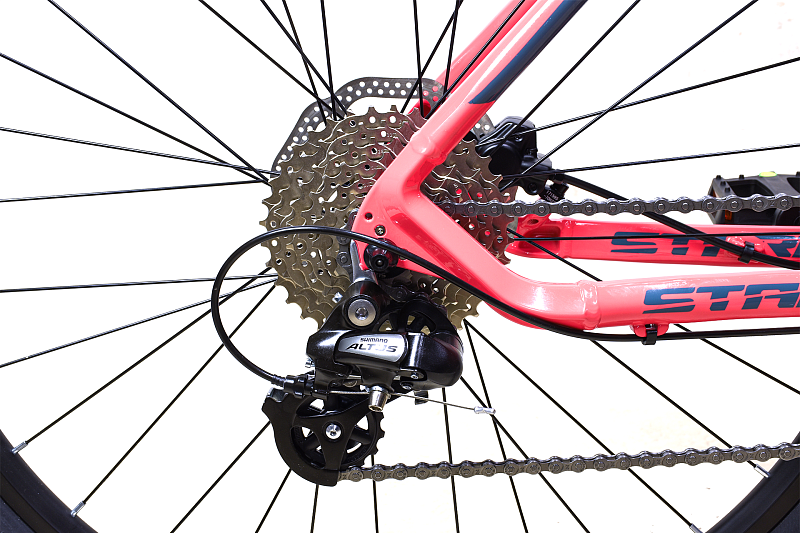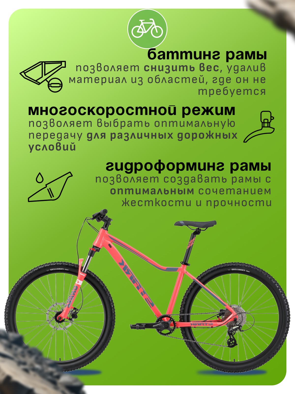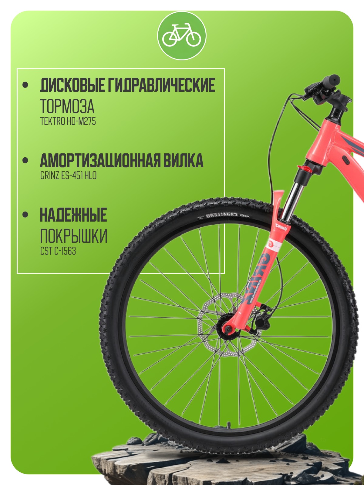 Женский горный велосипед c оборудованием начального любительского класса Shimano, 8 скоростей. Технические особенности: легкая алюминиевая рама AL-6061 (гидроформинг, внутренняя проводка всех тросов), амортизационная вилка Grinz ES-451 MLO (ход 100 мм, предварительная нагрузка, блокировка), двойные алюминиевые обода Qijian DA-18, дисковые гидравлические тормоза Tektro HD-M275 (роторы 180/160 мм). Подходит для активной езды по различным дорогам и пересеченной местности. Диаметр колес - 27,5 дюймов. Вес - 13,8 кг.