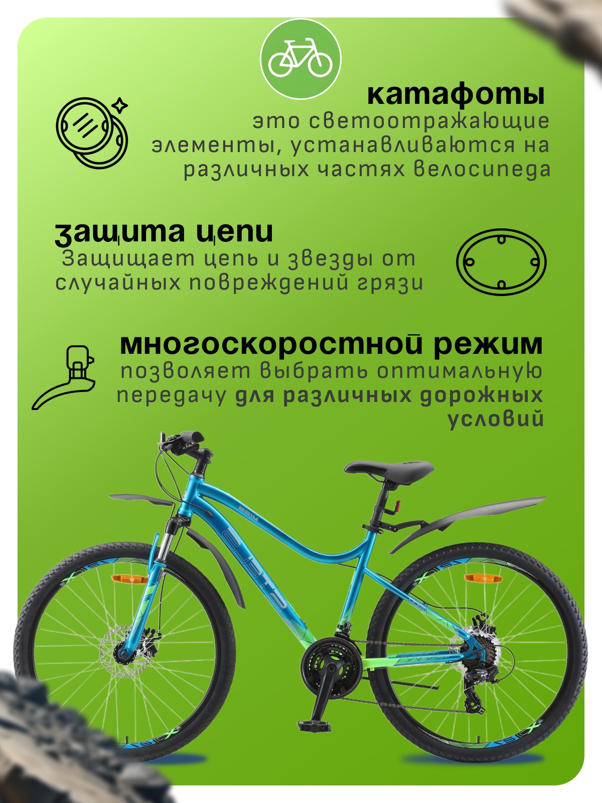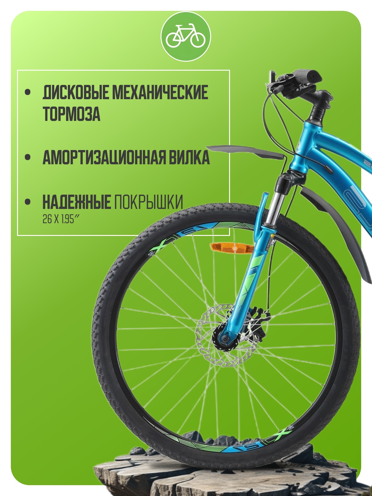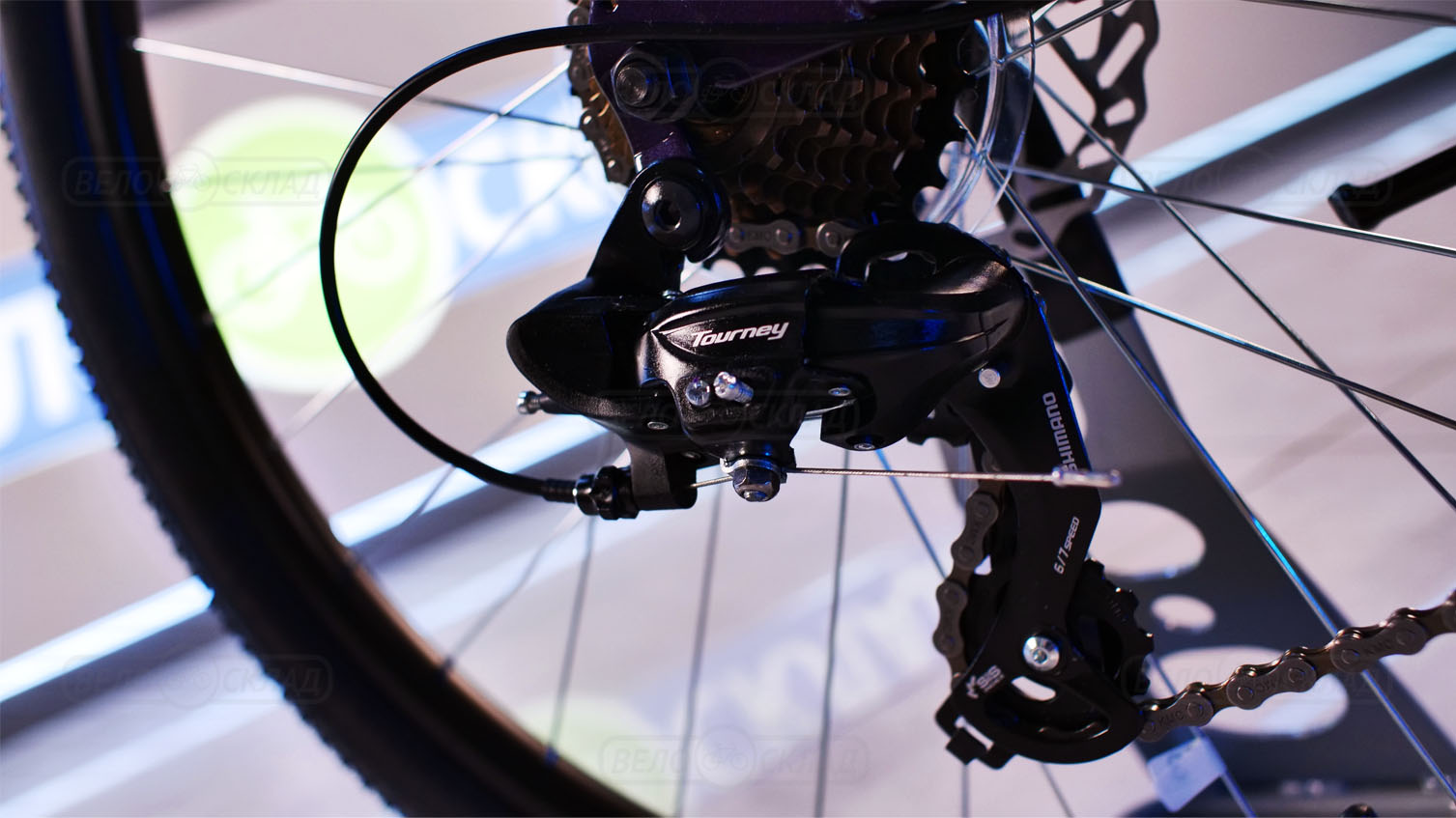 Женский горный велосипед с оборудованием начального класса Shimano, 21 скорость. Технические особенности: прочная стальная рама (формированные трубы, интегрированный петух, скрытая прокладка тросов, кареточный стакан BSA, рулевой стакан ZS, крепление калипера IS), амортизационная вилка (стальная, ход 60 мм, крепление калипера IS), двойные алюминиевые обода (под AV ниппель), дисковые механические тормоза (роторы 160/160 мм), катафоты, подножка. Подходит для прогулочной езды по различным дорогам и пересеченной местности. Диаметр колес - 26 дюймов. Вес - 17,92 кг.