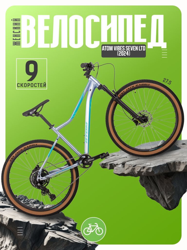 Женский горный велосипед с оборудованием предпрофессионального класса Shimano, 9 скоростей. Технические особенности: рама ATOM V7 TFS, амортизационная вилка ATOM RADIUM 32 Lite HLO, двойные алюминиевые обода ATOM 27.5 Comp, дисковые гидравлические тормоза Shimano BR-MT200. Подходит для активной езды по различным дорогам и пересеченной местности. Диаметр колес - 27,5 дюймов. Вес - 13,2 кг.