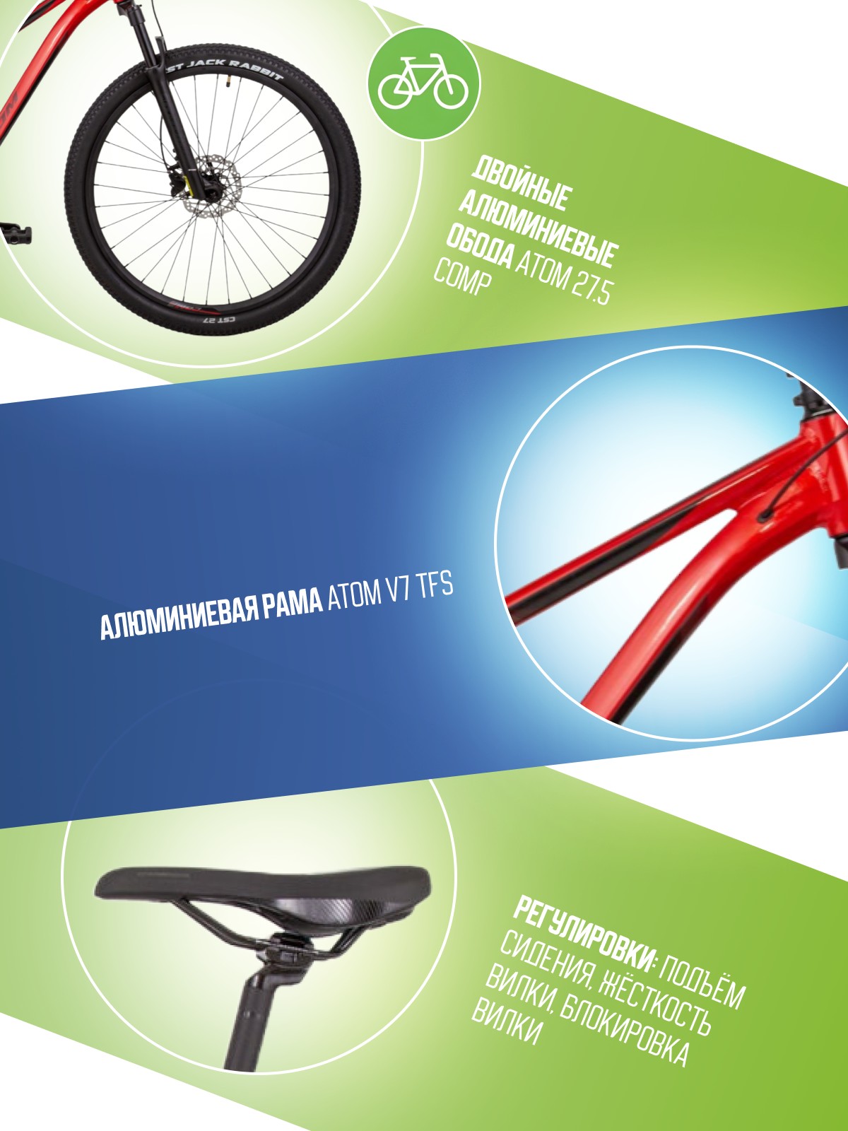 Женский горный велосипед с оборудованием любительского класса Shimano, 18 скоростей. Технические особенности: алюминиевая рама ATOM V7 TFS (двойной баттинг, скрытая проводка), амортизационная вилка ATOM Radium 30 HLO (пружинно-эластомерная, ход 100 мм, гидравлическая блокировка), двойные алюминиевые обода ATOM 27.5 Comp, дисковые гидравлические тормоза Shimano BR-MT200 (роторы Shimano SM-RT10-S Centerlock 160/160 мм). Подходит для активной езды по различным дорогам и пересеченной местности. Диаметр колес - 27,5 дюймов. Вес - 13,5 кг.
