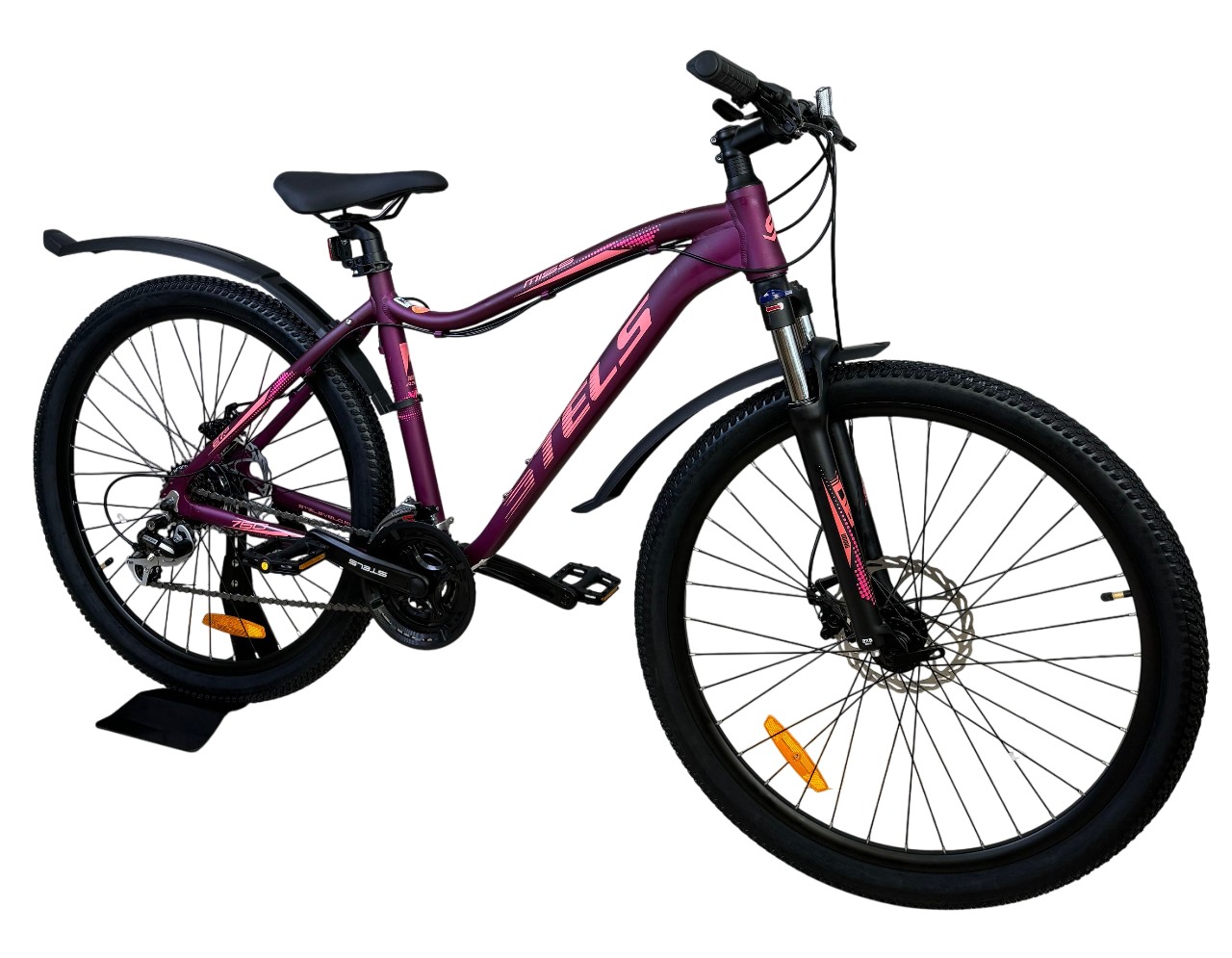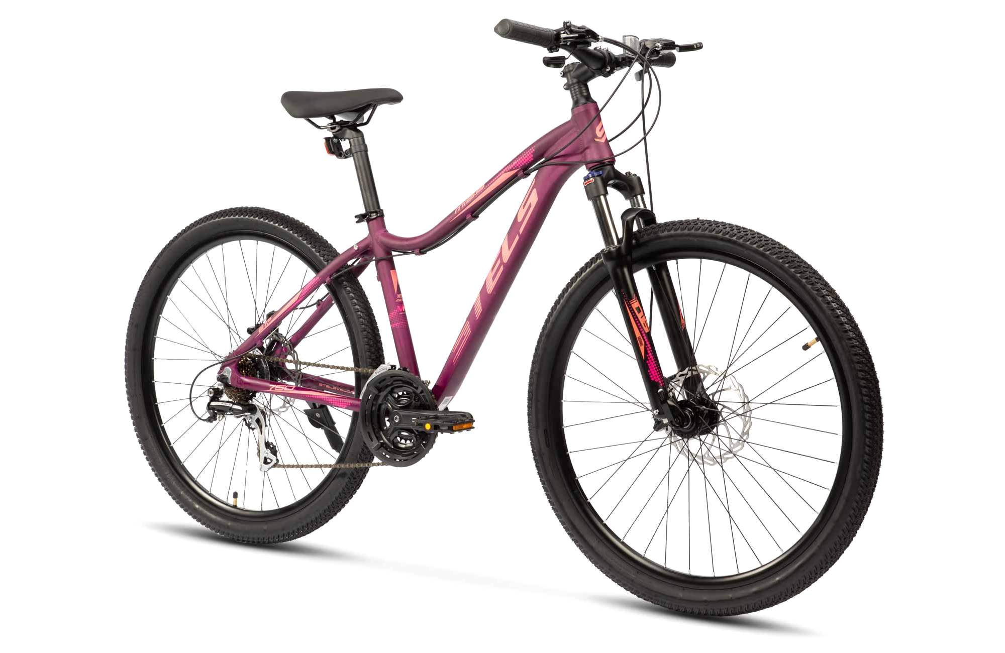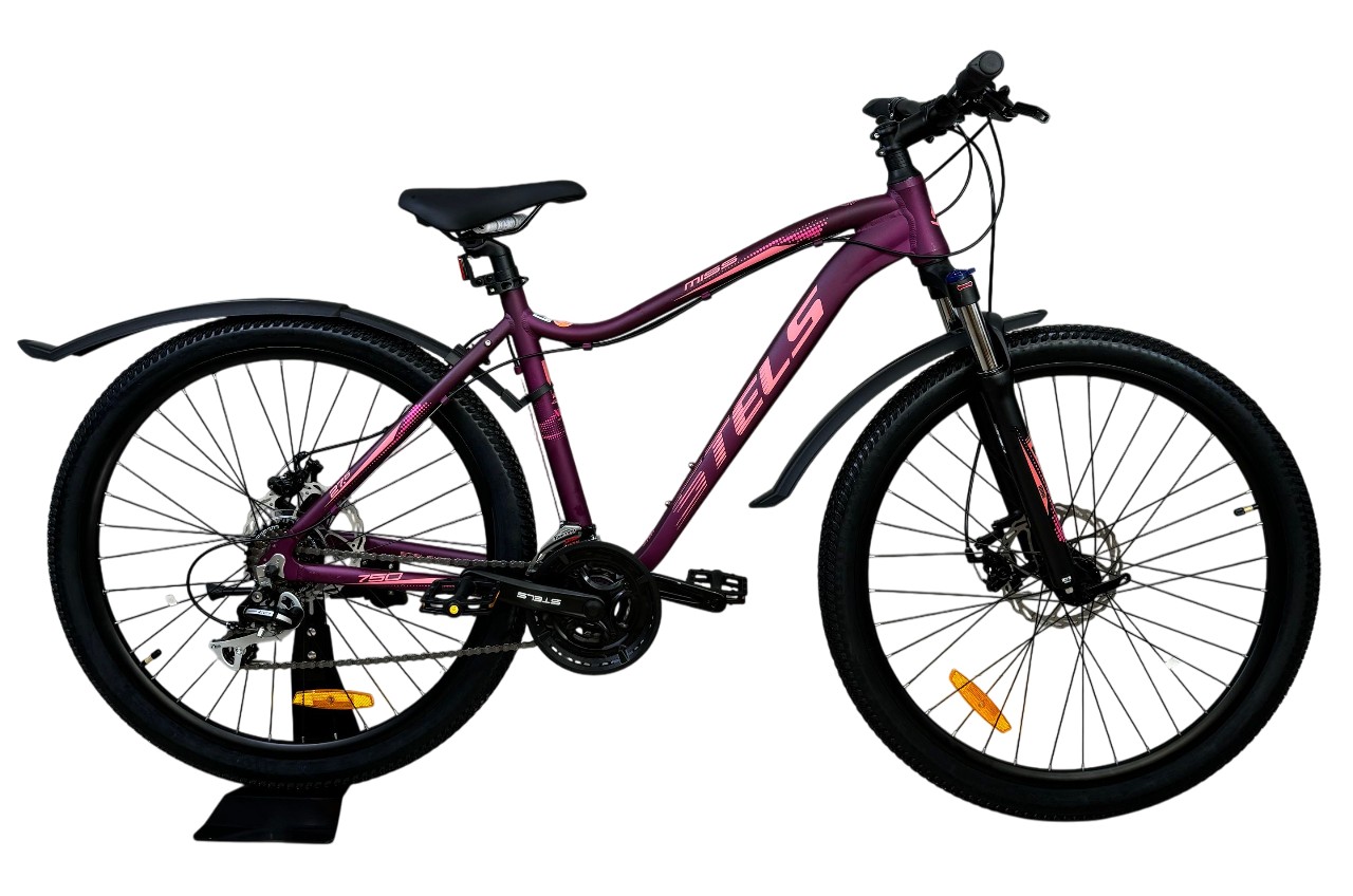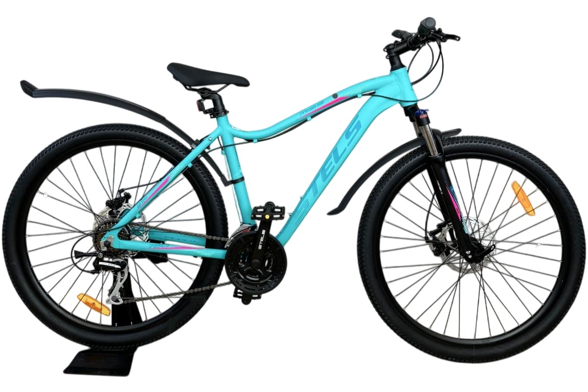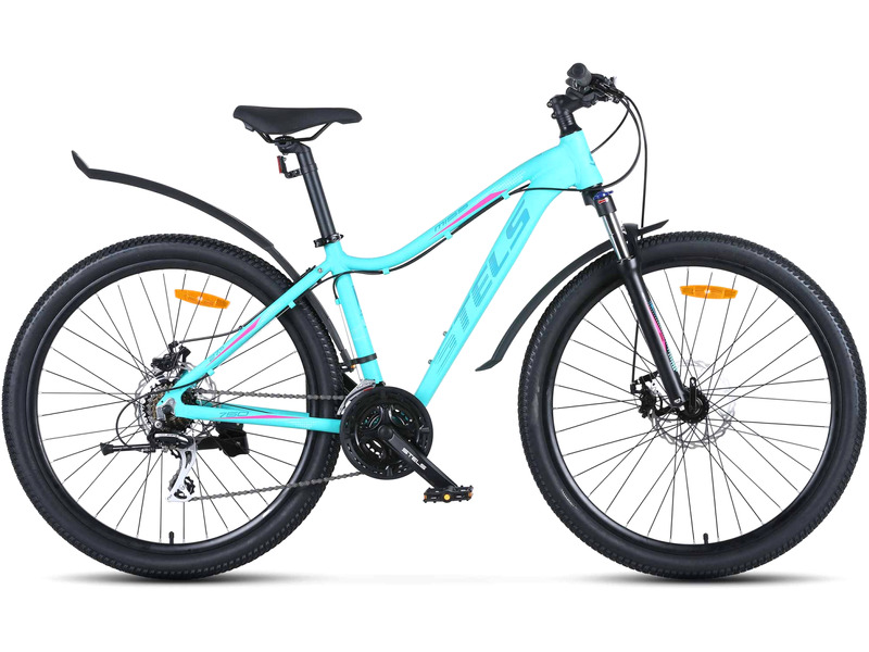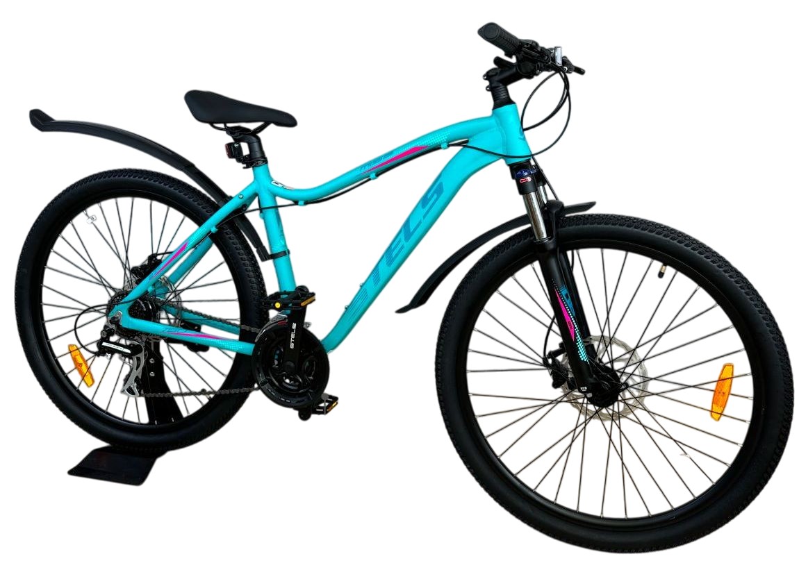 Женский горный велосипед с оборудованием любительского класса Shimano, 21 скорость. Технические особенности: легкая алюминиевая рама женская геометрия, открытая проводка, прямой рулевой стакан, кареточный стакан BSA, съемный петух), амортизационная вилка (пружинно-эластомерная, ход 80 мм, блокировка, регулировка преднагрузки, крепление калипера Post Mount), двойные алюминиевые обода (под AV ниппель), дисковые механические тормоза (роторы 180/160 мм), защита цепи, пластиковые крылья, подножка, катафоты. Подходит для активной езды по различным дорогам и пересеченной местности. Диаметр колес - 27,5 дюймов. Вес - 15,46 кг.