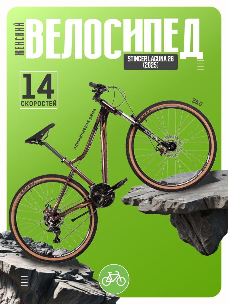 Женский горный велосипед с оборудованием начального класса Shimano, 14 скоростей. Технические особенности: легкая алюминиевая рама (сплав 6061-T6, полуинтегрированная рулевая колонка, кареточный стакан BSA, частично скрытая прокладка тросов, съёмный петух), амортизационная вилка STG Spice (пружинная, ход 110 мм, регулировка преднатяга пружины), двойные алюминиевые обода Felgebeiter VB-18 (под AV ниппель), дисковые механические тормоза STG (роторы 160/160 мм с креплением на 6 болтов), защита цепи, подножка. Подходит для активной езды по различным дорогам и пересеченной местности. Диаметр колес - 26 дюймов. Вес - 15 кг.