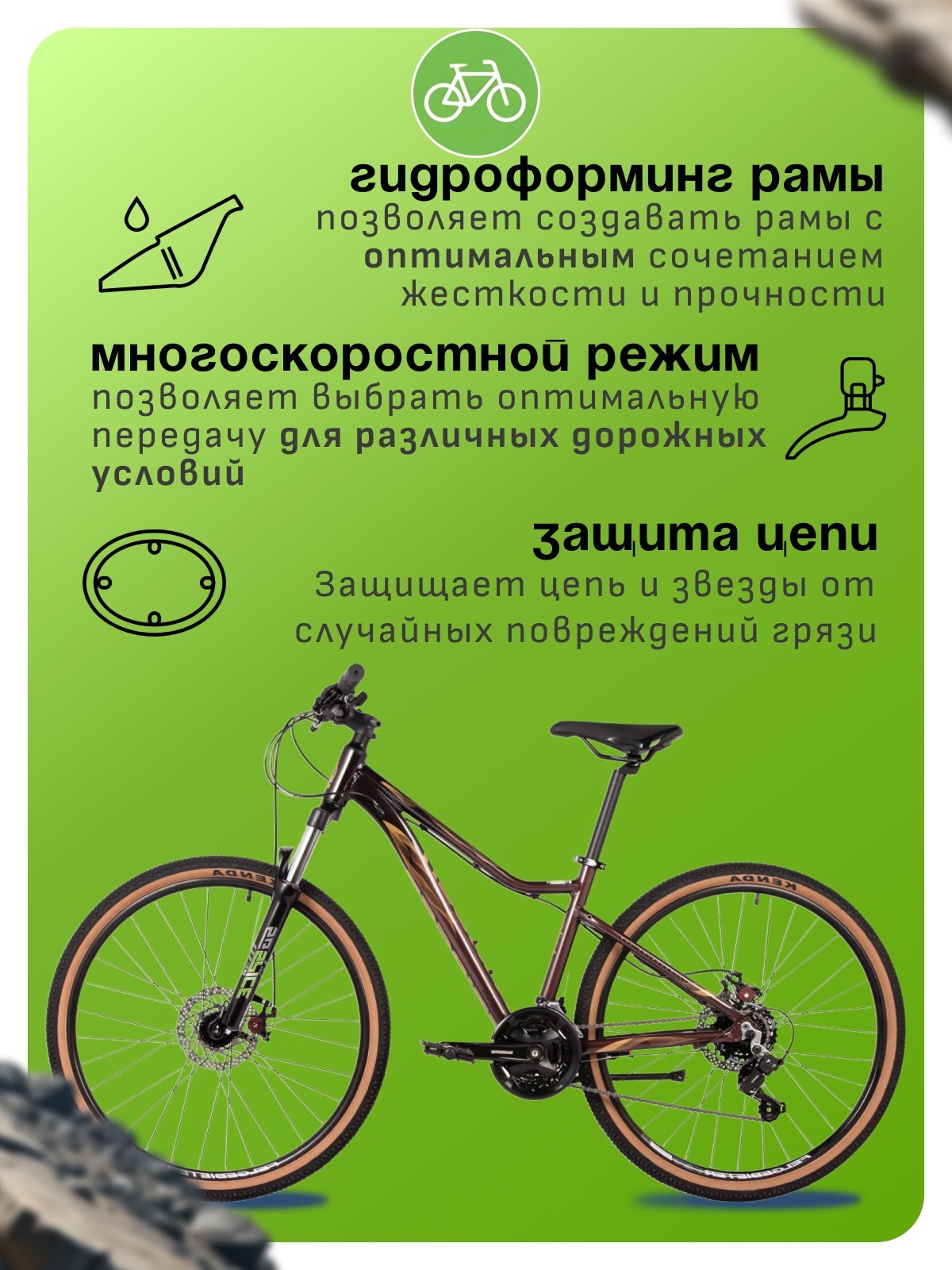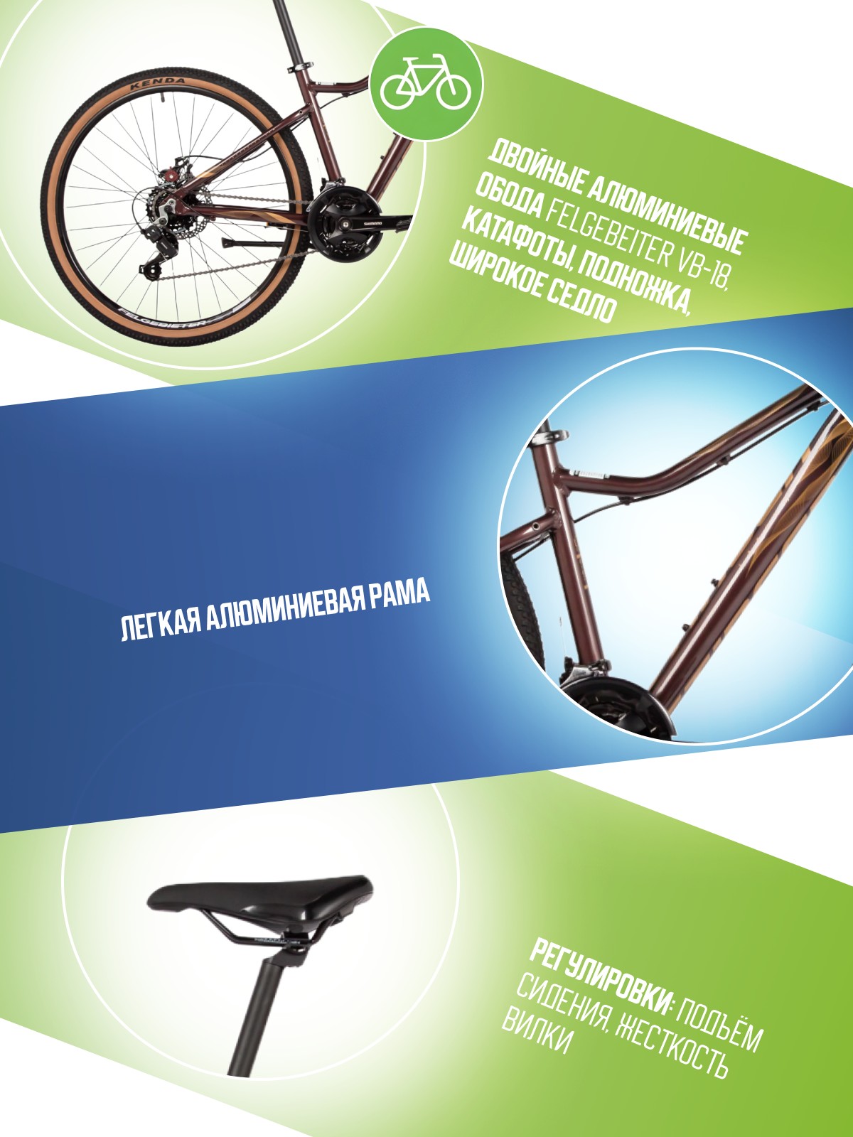 Особенности велосипеда: Алюминиевая рама, Амортизационная вилка, Гидроформинг рамы, Двойные обода, Дисковые тормоза, Защита цепи, Катафоты, Многоскоростной, Подножка, Широкое седло.