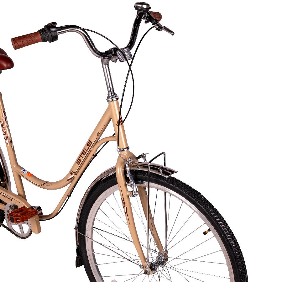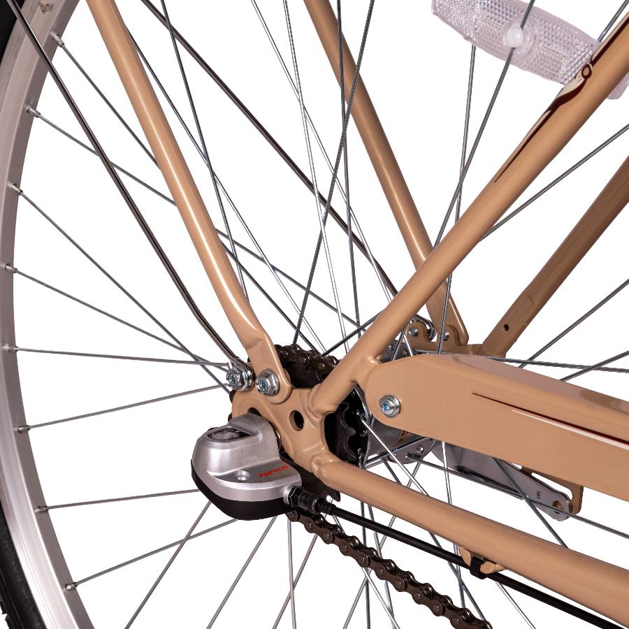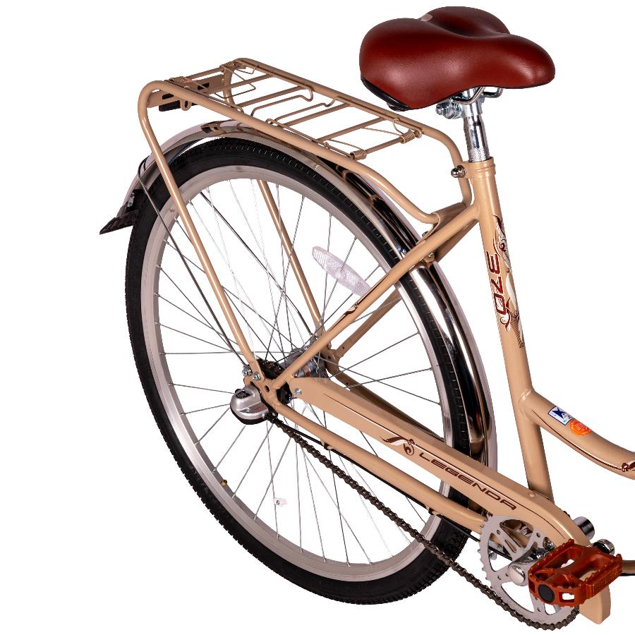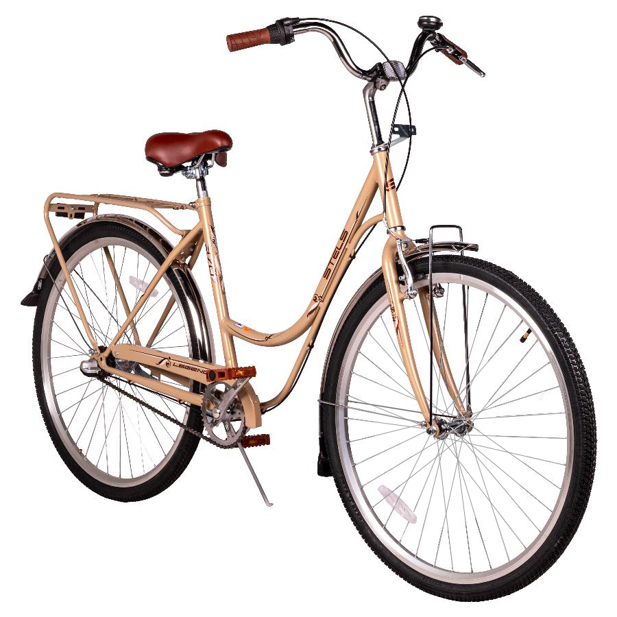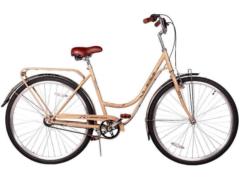 Женский дорожный велосипед с оборудованием планетарного типа Shimano, 3 скорости. Технические особенности: прочная стальная рама (открытая проводка, кареточный стакан BSA, прямой рулевой стакан), жесткая стальная вилка, двойные алюминиевые обода (под AV ниппель), передний тормоз - ободной V-brake, задний тормоз - ножной, задний багажник, полноразмерные крылья, защита цепи, комфортное седло, катафоты, подножка, звонок. Подходит для прогулочной езды по ровным дорогам и по несложной пересеченной местности. Диаметр колес - 28 дюймов. Вес - 18 кг.