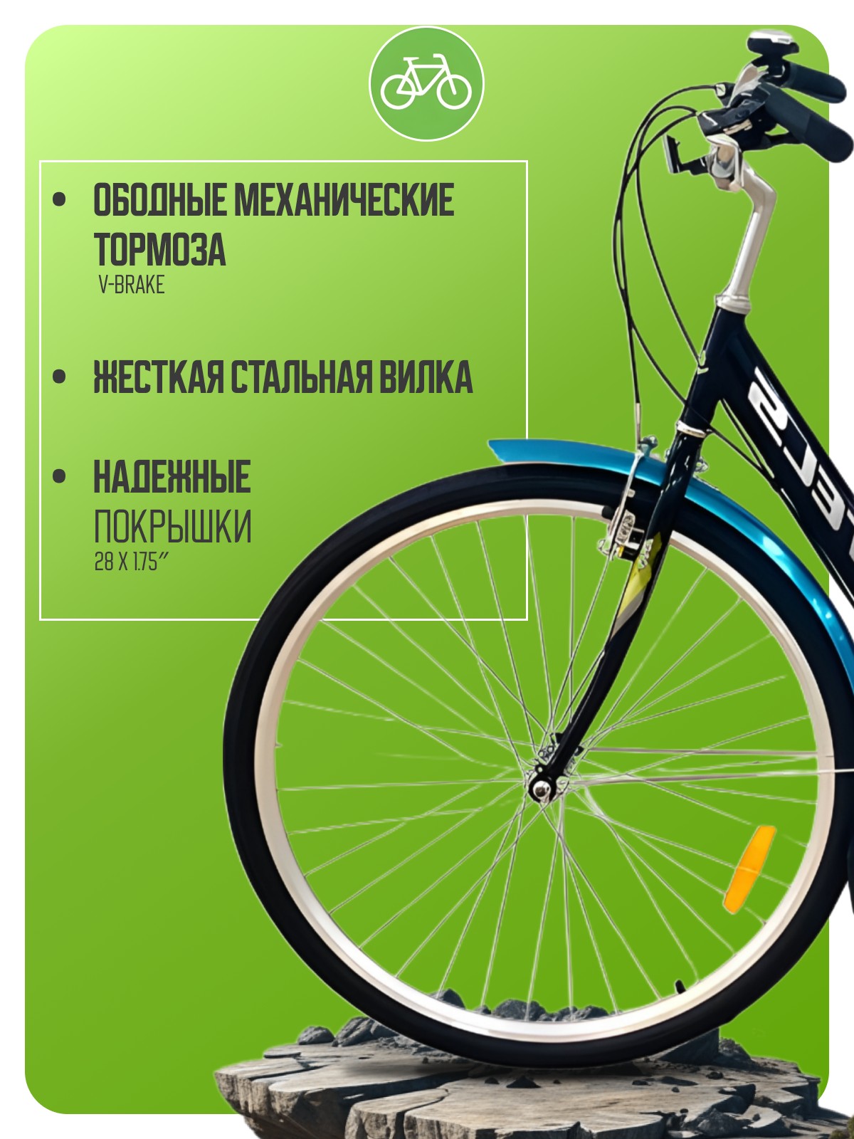 Женский дорожный велосипед для катания в городской среде, с оборудованием начального класса Shimano, 7 скоростей. Технические особенности: прочная стальная рама (интегрированный подседельный хомут, кареточный стакан BSA), жесткая стальная вилка (резьбовой шток), двойные алюминиевые обода (под AV ниппель), ободные механические тормоза V-Brake (стальные рычаги), защита цепи, длинные крылья, задний багажник, комфортное седло, звонок, подножка, катафоты. Подходит для прогулочного катания в городских условиях. Диаметр колес - 28 дюймов. Вес - 18,11 кг.