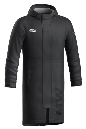 Два внешних кармана на молнии для хранения документов или спортивной экипировки пловца. Два внутренних кармана, один из которых для удобного использования имеет доступ снаружи под передней планкой и подойдет для хранения мобильного телефона. Внутренний шнурок на талии дает возможность утянуть куртку по фигуре. Разрез на подоле для удобства движения, который при необходимости застегивается на липучки.