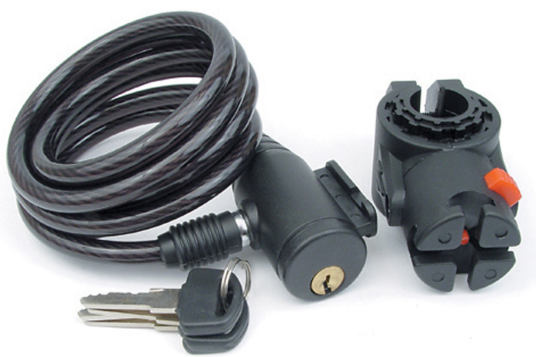 Одна из самых популярных моделей замков: длинный стальной плетеный трос 8х1500мм в нейлоновой оболочке, автоматический замок с 4 комплектами ключей, крепление к подседельному штырю велосипеда  быстросъемный замок .