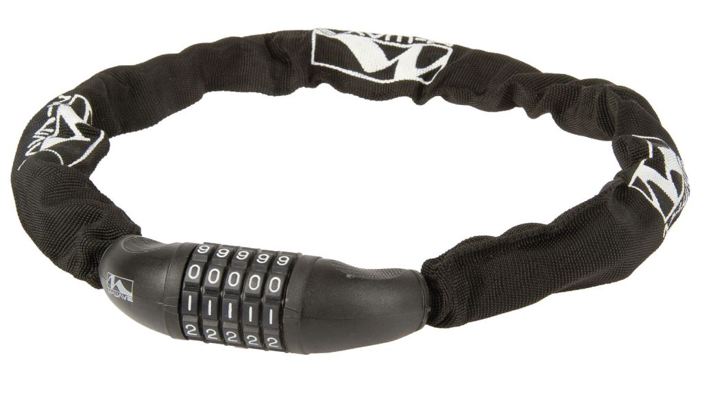 Велозамок-цепь обладает практически таким же уровнем защиты от угона, как и замок-скоба, но при этом гораздо более неприхотлив в плане пристегивания, так как может огибать неровности. Данный замок создан на основе цепи, скованной из прутков диаметром 6 мм, длина составляет 850 мм. В целях защиты лкп велосипеда, цепь помещена в прочный нейлоновый чехол. Исключается риск потери ключа, так как замок отпирается путем введения пятизначного кода, который владелец задает самостоятельно.