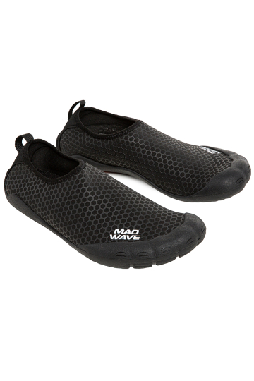 Семь отверстий на нижней части подошвы отводят воду, благодаря чему обувь быстро сохнет. Подошва, переходящая в носок, защищает пальцы и предотвращает истирание ткани, обеспечивая долговечность акватапок. Эластичная резинка надежно фиксирует аквашузы на ноге и предотвращает попадание песка внутрь обуви. Воздухопроницаемая текстильная сетка обеспечивает комфорт и вентиляцию. Для удобства снятия и надевания на пятке расположена специальная петелька.