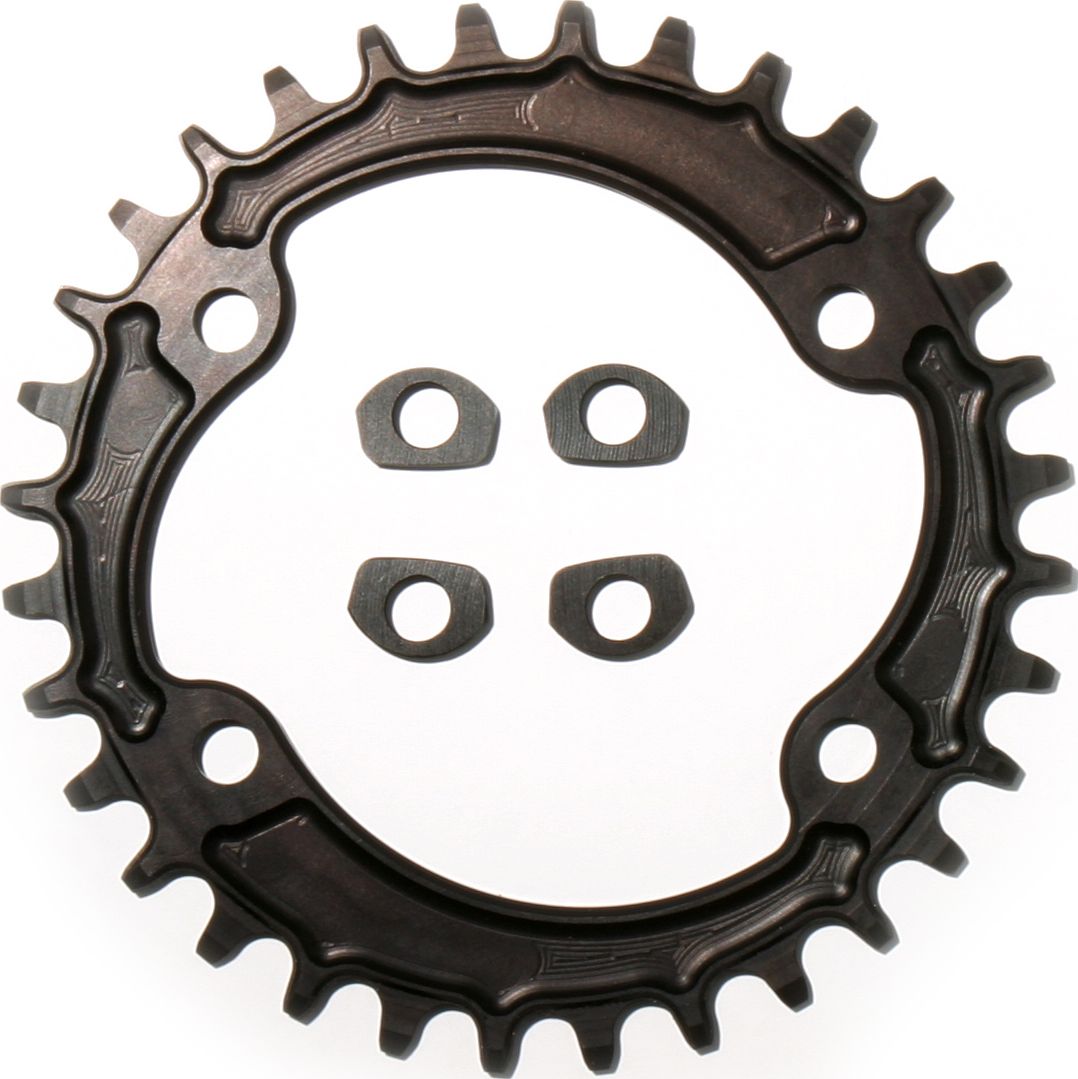 Звезда с зубцами переменной ширины. Оптимизированные профиль и толщина зуба для лучшего удержания цепи. Изготовлена путем фрезерования из высокопрочного алюминия марки 7075 Т6. От направляющих цепи можно отказаться даже в ДХ, проверено.