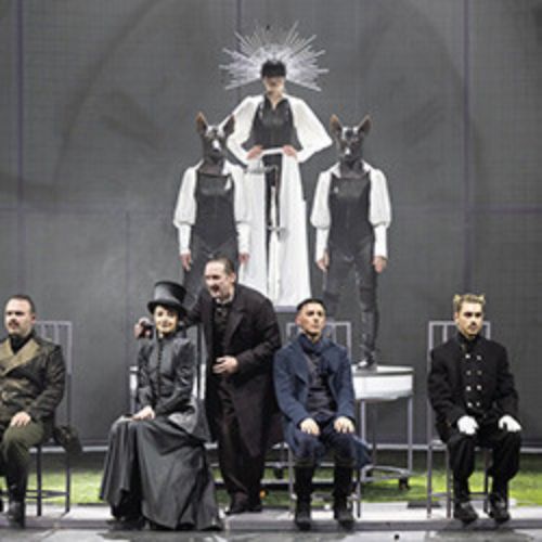 Единственная декорация спектакля — десятиметровый круговой подиум, ограниченный решетками с анфиладой дверей. Герои, как по кругам ада, будут ходить по этому кругу, а переходы из одного места действия в другое будут решены проекцией.