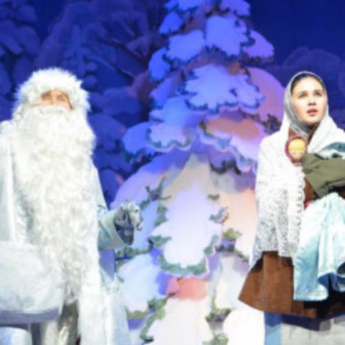 Это веселая праздничная ярмарка с зазывалами и глашатаями. Среди участников празднества и главные герои сказки – капризная, разбалованная Акулина и её мамаша, Мачеха, отец, который вынужден будет бросить дочку Настеньку замерзать в лесу. Таинственный и добродушный персонаж спектакля Морозко, наблюдающий за людьми, благодаря которому справедливость, конечно же, восторжествует. Юная Настенька, бесконечно добросердечная, её жених Иванушка – прямодушный, открытый юноша, будут бесконечно рады и счастливы. Лесные жители – Баба Яга, Леший, пугающие детей, вызывают тут исключительно симпатию и сочувствие.