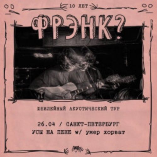 Анти-фолк/эмо проект фрэнк? празднует свое десятилетие акустическим туром! Приглашаем вас в последний раз услышать главные хиты уходящей декады в классическом формате. Только звонкая гитара, искренняя лирика и никаких границ со слушателем.