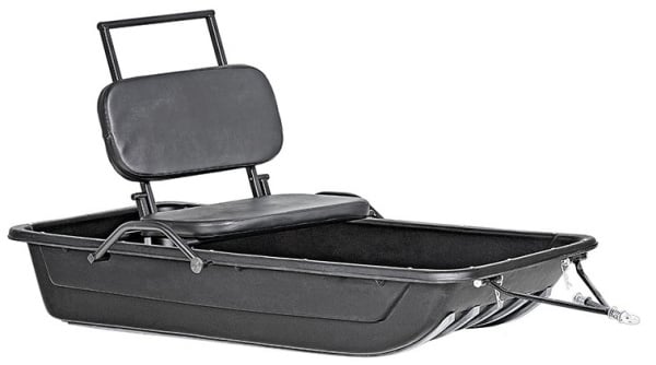 Мягкое деревянное сиденье сделано из стальной трубы с порошковой окраской и фанеры; сверху надевается съемный чехол (на молнии) из экокожи с мягкими проставками. Отлично подойдет для людей весом свыше 100 кг. Высокая приподнятая часть спинки является ручкой, за которую может держаться стоящий за водителем человек - это позволит безопасно ездить вдвоем в одних санях. Для удобства перевозки сиденье сделано складным.