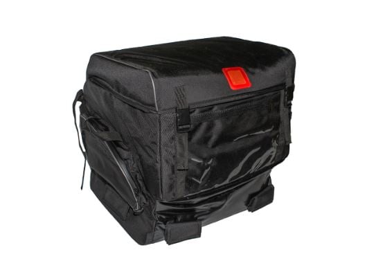 В верхней крышке расположен органайзер для мелких вещей. Внутренний объем кофра, имеет ПВХ отделку (легко мыть, не промокает), разделен на несколько отделов съемной жесткой перегородкой. Имеется специальное отделение для стояночного чехла. 2 сетчатых кармана для перевозки термосов внутри основного отделения. На боковых внешних стенках имеются карманы на молнии. Для удобства переноски кофра, ручки перенесены над карманами. Все самые истираемые места усилены прочной ПВХ тканью. Светоотражающий катафот контрастного цвета приварен на фронтальной поверхности.