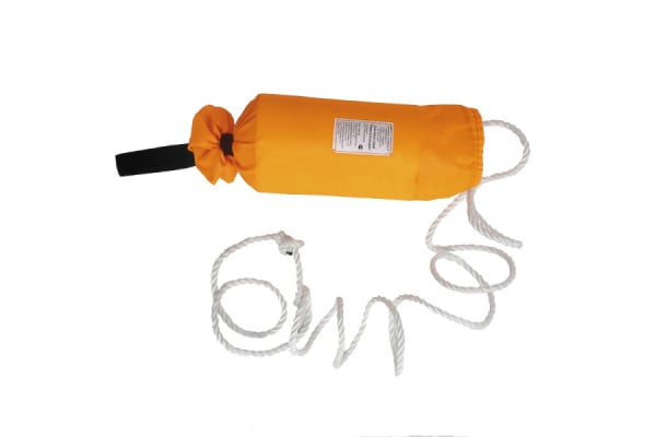 Спасательный фал (Конец Александрова). Может быть в разных вариантах исполнения. Это наиболее удобно и эффективно для надувных лодок и небольших пластиковых и алюминиевых лодок. Т.к. занимает крайне мало места из без того в небольшом кокпите. Предназначен для спасания утопающих. Способ применения - при помощи застежки освобождаем один конец троса с петлей. Одеваем петлю на руку и не вынимая трос из корпуса кидаем в сторону терпящего бедствие. В полете уложенный трос (15 метров) вылетает из корпуса. Вторая часть троса с петлей прочно зафиксирована на корпусе. Сам корпус и шнур не тонут и покрыты светоотражающей тканью, поэтому утопающий подплывает, одевает вторую петлю на руку и вы подтаскиваете его к лодке.