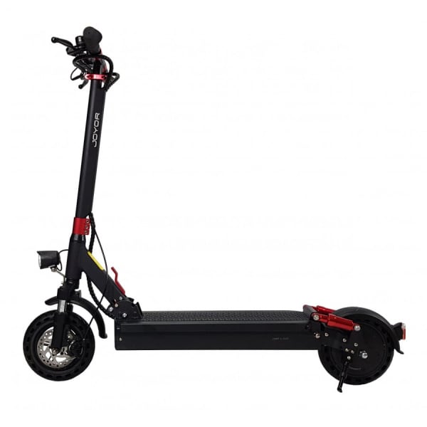 Стильный дизайн электросамоката Джойор Джи1 имеет складную конструкцию. В максимально сложенном виде самокат удобно брать с собой в любой общественный транспорт, хранить дома или на работе. Благодаря телескопическую рулевой стойке, вы сможете отрегулировать высоту руля от 76 до 102 см, настраивая под рост райдера. Справа на руле находится бортовой компьютер, отображающий на ярком LED-дисплее все важные показатели, такие как, скорость, выбранная передача, общий пробег, заряд аккумулятора и другое. Дизайн новинки продуман до мелочей: эффектная черно-красная рама, удобные и тактильно приятные грипсы, декорированное противоскользящее покрытие.