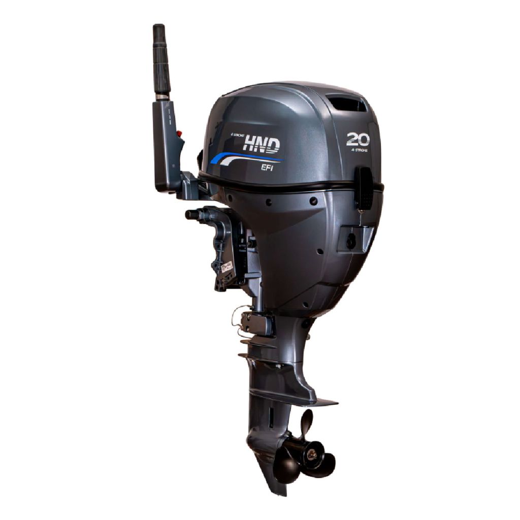 Представляем 4-тактный подвесной лодочный мотор HND 20 FIEHS номинальной мощности 20 лошадиных сил и рабочим объемом 345 см³. Время передовых технологий EFI! Описание МТО: F - 4-тактный двигатель; I - инжектор (EFI); E - электростартер; H - румпельное управление; S - короткий дейдвуд.