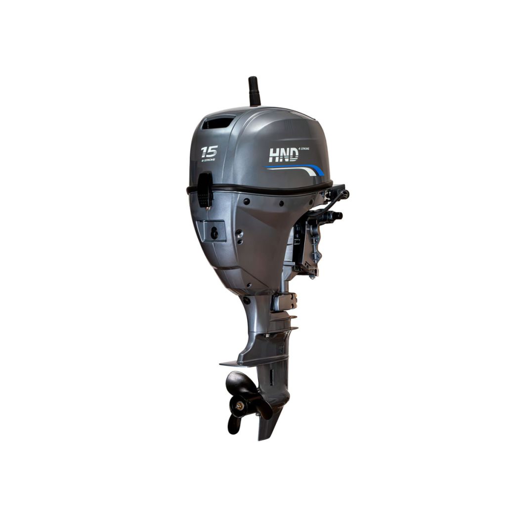 Представляем 4-тактный подвесной лодочный мотор HND OB15 FEHBS номинальной мощности 15 лошадиных сил и рабочим объемом 345 см³. Расшифровка МТО: F - 4-тактный двигатель; E - электростартер; H - румпельное управление; B - литиевый аккумулятор в комплекте; S - короткий дейдвуд