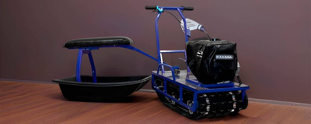 Двигатель Lifan 6,5 с редуктором 1/2 и автоматическим сцеплением. Возможность передвижения по снегу глубиной до 30см. Лучшая проходимость при своих габаритах благодаря тому, что вес водителя распределен между санями и буксировщиком.