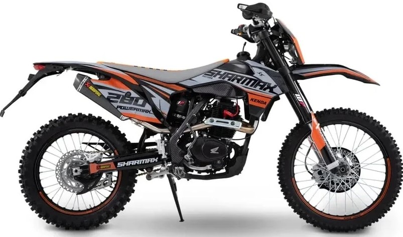 Подвеску Sharmax Power Max 280 можно настроить под грязь, камни и песок без потери качества. Передняя вилка фирмы KKE имеет регулировки сжатия и отбоя, задняя (KKE) — справится с любыми преградами, от камней до деревьев. Байк легко настроить под свой вес, подобрав идеальный баланс жёсткости.