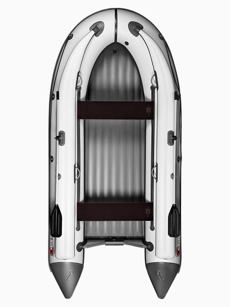 Лодка Grace 420 с тримаранным типом днища в комплектация с фальшбортом. Фальшборт выполнен с поперечной перегородкой. Это дает ряд преимуществ, в отличие от фальшбортов круглой формы.