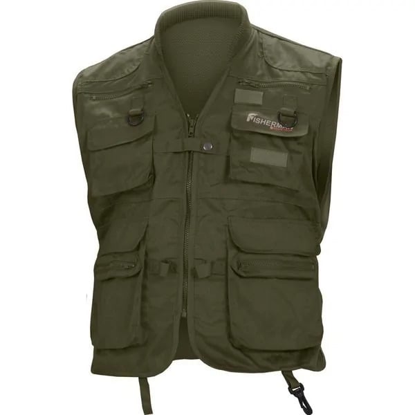 Многофункциональный жилет из смесовой ткани на подкладке из сетки. Центральная застежка молния и трикотажный воротник. Боковые регулировки по объему. На полочке 6 грузовых карманов разного объема и 2 прорезных кармана, на верхнем кармане липучка – Velcro – для крепления снастей. Для поддержки удилища, есть крепление “Третья рука”. На спинке 1 большой грузовой карман.