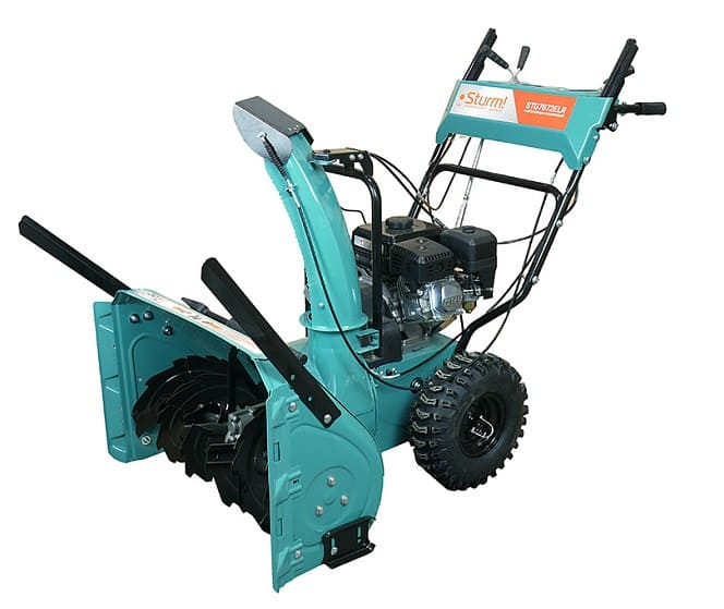 Бензиновый снегоуборщик Sturm! STG7672ELR — это самоходная двухступенчатая снегоуборочная машина, оснащенная зимним вариантом надежного четырехтактного бензинового двигателя модели 170F. Система управления двигателем обеспечивает его работу в оптимальном диапазоне максимального крутящего момента, что даёт хорошую энерговооружённость для выполнения тяжёлых работ. «Сухая» гильза цилиндра двигателя из высокопрочного материала обеспечивает долговечность цилиндропоршневой группы. Зазубренный шнек первой ступени успешно измельчает слежавшийся снег и может справиться даже с настом толщиной до 2 см. Высокооборотистая вторая ступень снегоуборочного агрегата отбрасывает снег на расстояние до 12 м. Широкие колеса с развитым анти-снежным протектором позволяют уверенно двигаться по рыхлому снегу.