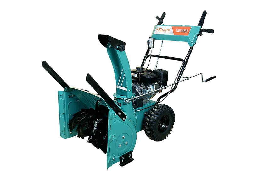 Бензиновый снегоуборщик Sturm! STG7661ELR — это самоходная двухступенчатая снегоуборочная машина, оснащенная зимним вариантом надежного четырехтактного бензинового двигателя модели 170F. Система управления двигателем обеспечивает его работу в оптимальном диапазоне максимального крутящего момента, что даёт хорошую энерговооружённость для выполнения тяжёлых работ. «Сухая» гильза цилиндра двигателя из высокопрочного материала обеспечивает долговечность цилиндропоршневой группы. Зазубренный шнек первой ступени успешно измельчает слежавшийся снег и может справиться даже с настом толщиной до 2 см. Высокооборотистая вторая ступень снегоуборочного агрегата отбрасывает снег на расстояние до 12 м. Широкие колеса с развитым анти-снежным протектором позволяют уверенно двигаться по рыхлому снегу.
