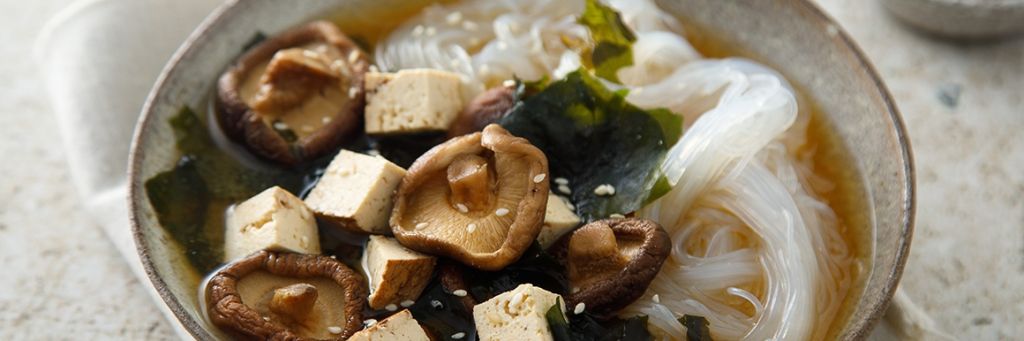 Ингредиенты: 600 мл воды, 1,5 ч. ложки хондаши, 1 брикет фунчозы (около 100 г), 70 г тофу (например, копченого), 1 ст. ложка вакамэ, горсть сушеных шиитаке (или других грибов), 1 ст. ложка пасты мисо, кусочек имбиря.